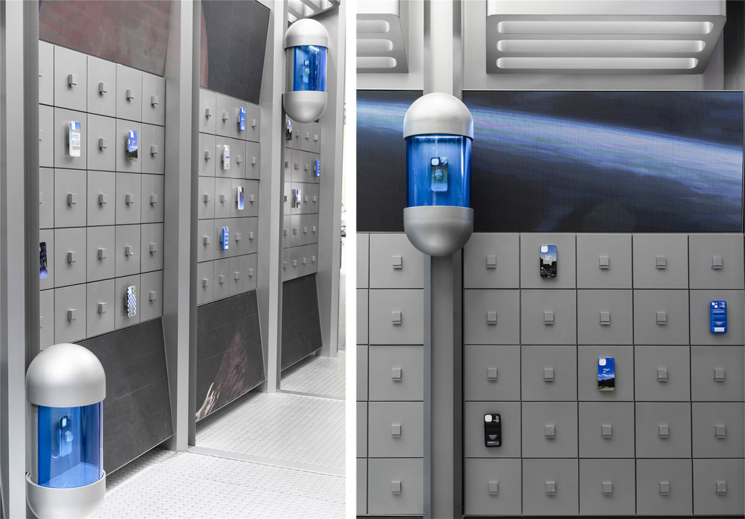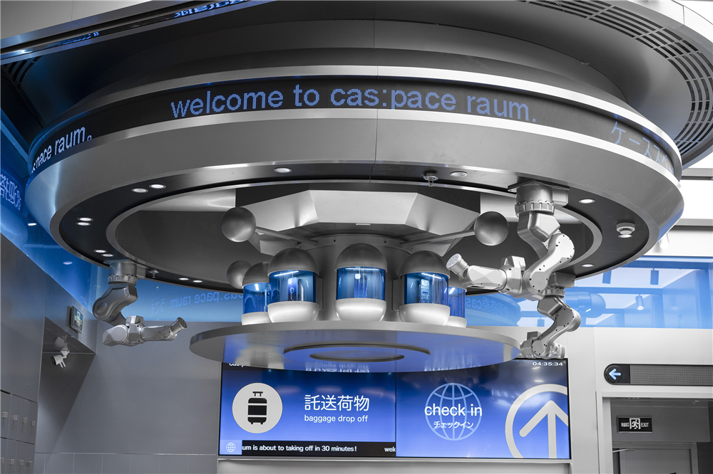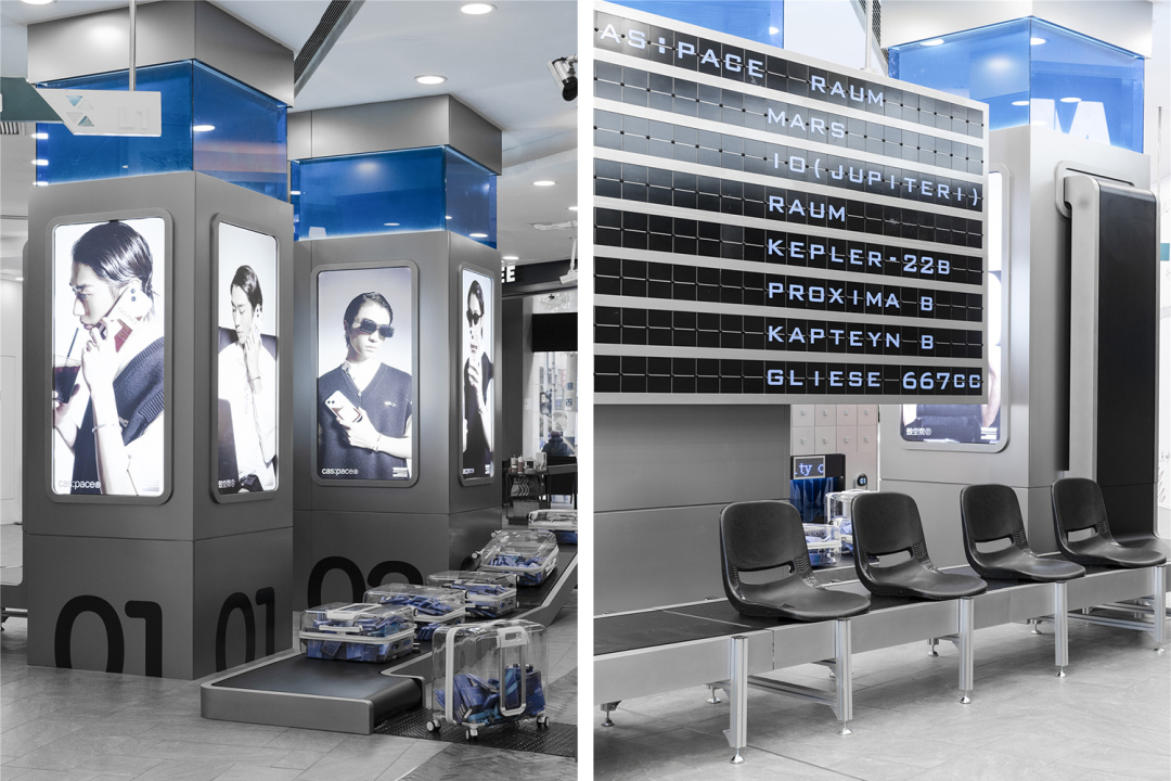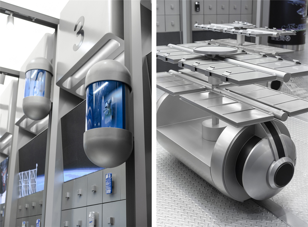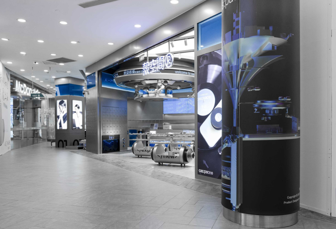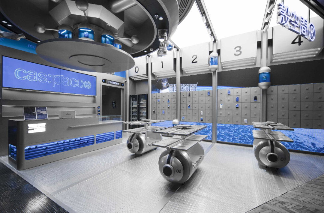 宇宙电梯是一个宏大的计划与构想,这次设计却是要把它融入到一个80㎡的空间中,是一件很有挑战的任务。最终我们把场景叙事设定到了宇宙电梯的起点。把我们产品定义为需要被运输的对象“殻物质”。它需要通过等候,安检,服务中心,运输等一系列场景与动作才能出发到终点。这样的流程也像极了一个产品从生产开始最终到消费者手中需要经历的层层关卡,从而让顾客能体验到最优质的产品。