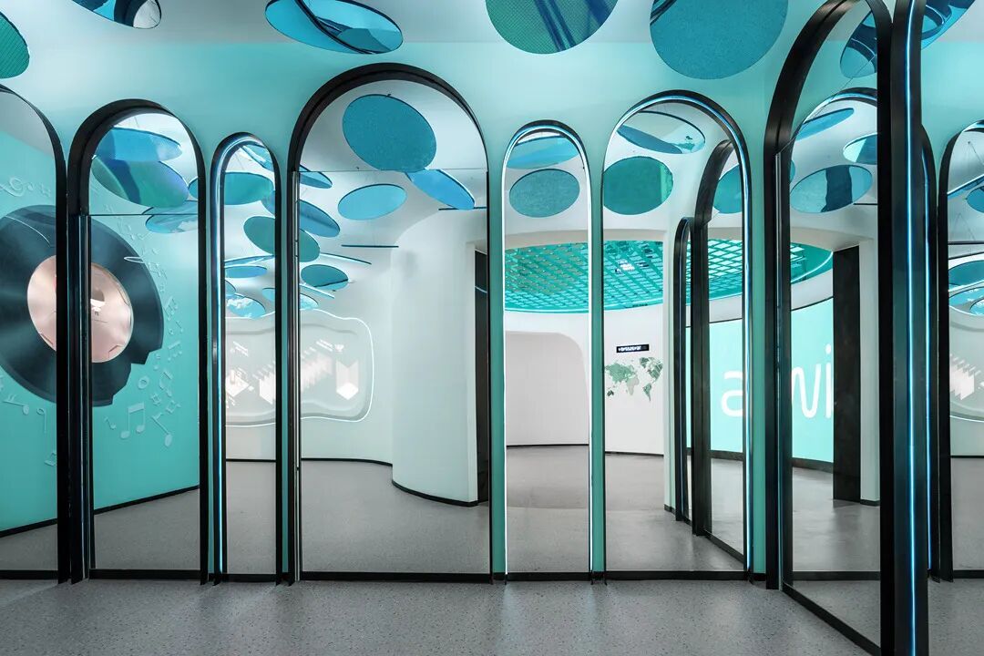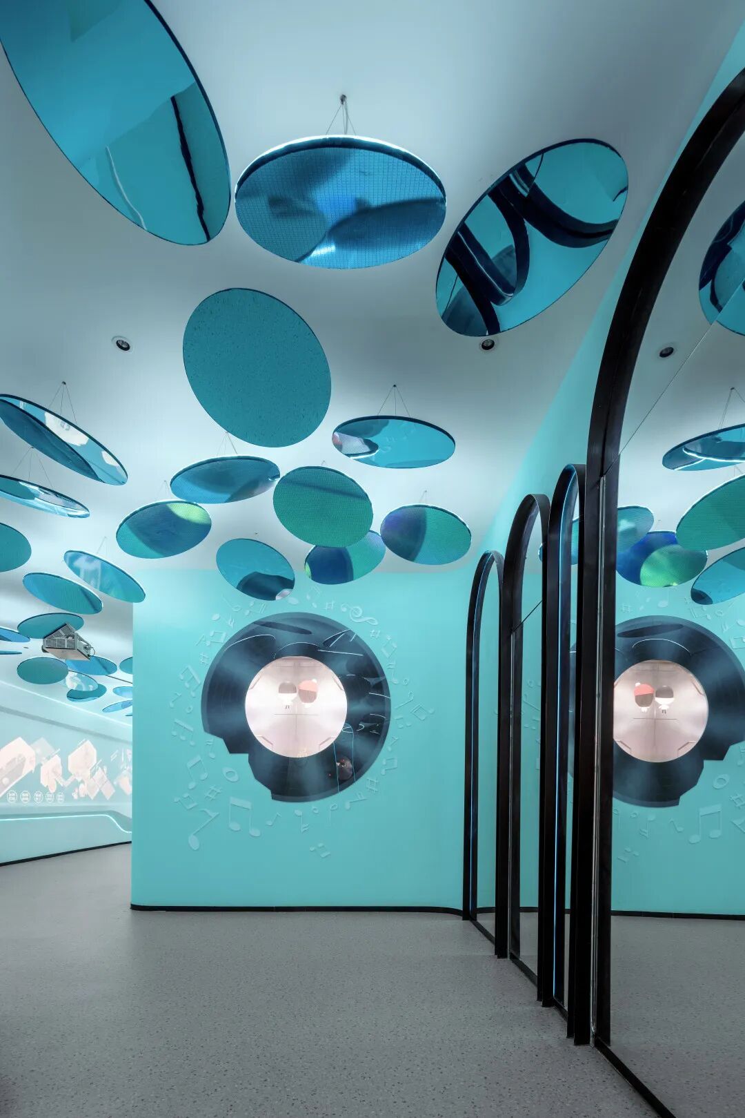 数字隧道的设计意在模拟信号传出频率,在不规则中探寻规律,构建独特视觉体验空间。路径上的圆盘光晕延伸视觉、引导想象,利用镜面反射特性营造虚幻的场景表达,与现实相生。