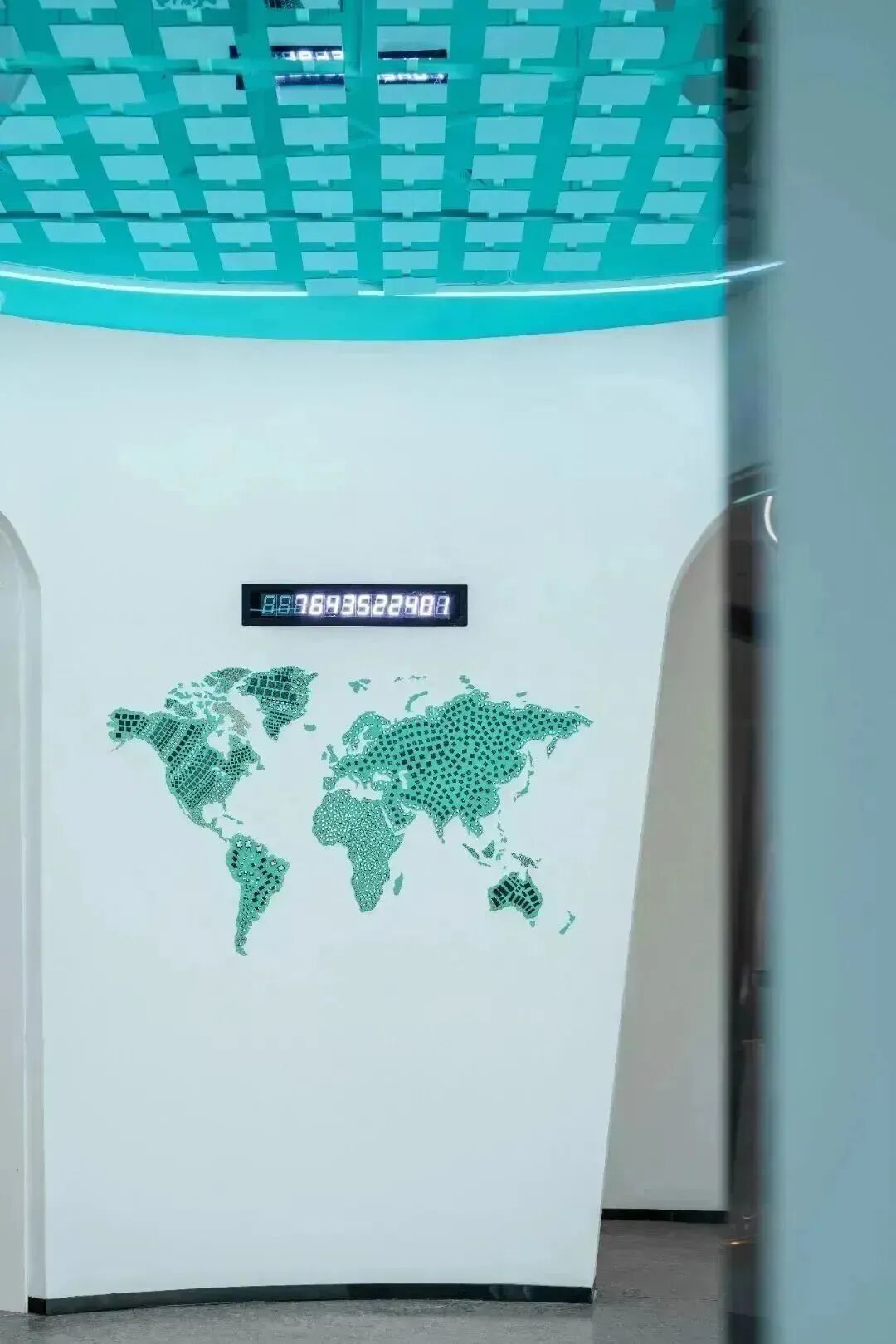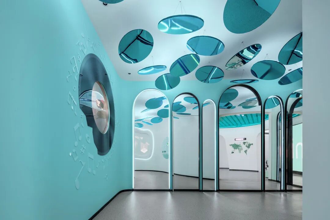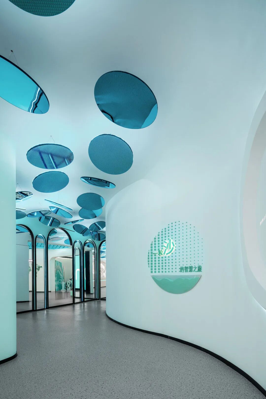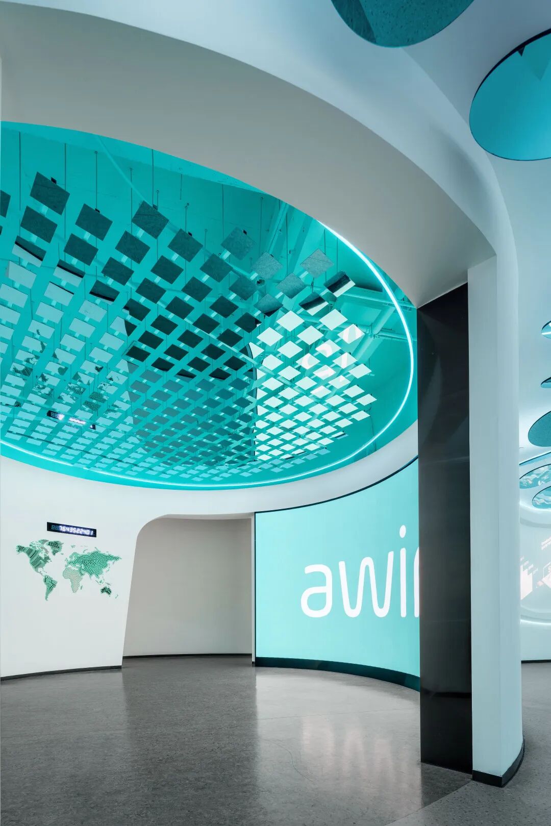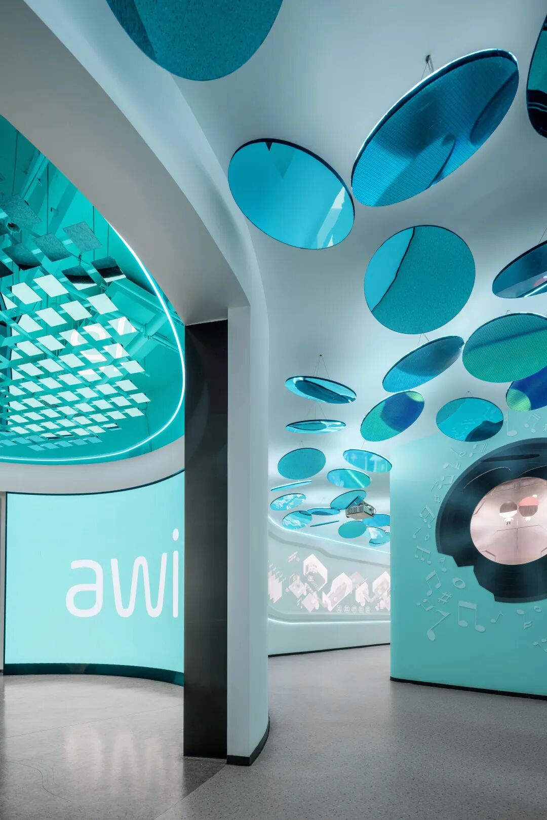 吊顶设计以晶圆纹理为灵感,周边以艾为蓝为环带。自顶至周,印象逐步深入,从天花延伸至下的隔墙将空间划分三个区域,其动线流畅、弧度柔和、彼此沟通。