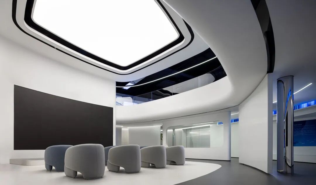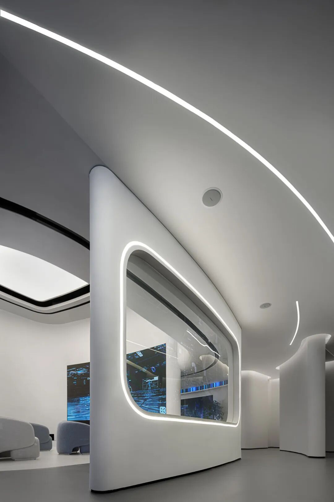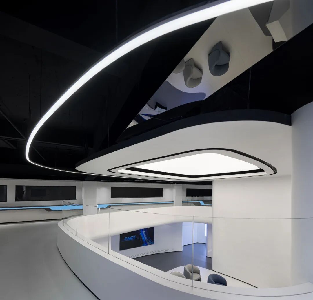 在材质及色彩上,整个空间以纯白并具有光泽的马来漆作为主要的饰面材料,表现了展厅的科技属性。