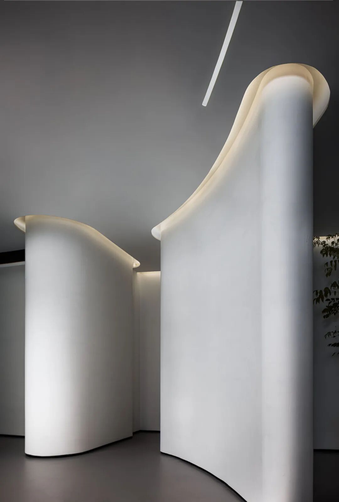 继续深入,你会被周围的细节处理所吸引:墙面与顶面的交接处做成了弧线的造型,在增强立体感的同时表达了升腾的理念。