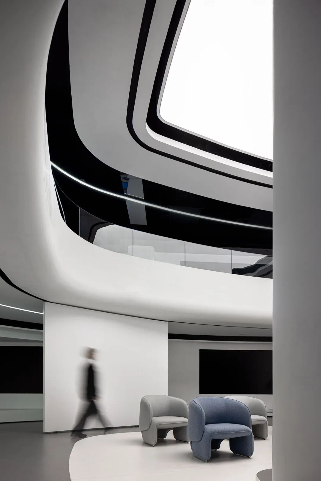 初入空间,最先感受到的会是动感的流线。在走过腾小圈全息投影及活动隔断墙之后,就来到了极富工业感的弧形中央挑空区域。在这里,通过对构件尺度的把控,给参观者营造出一种置身雕塑之中的景象。