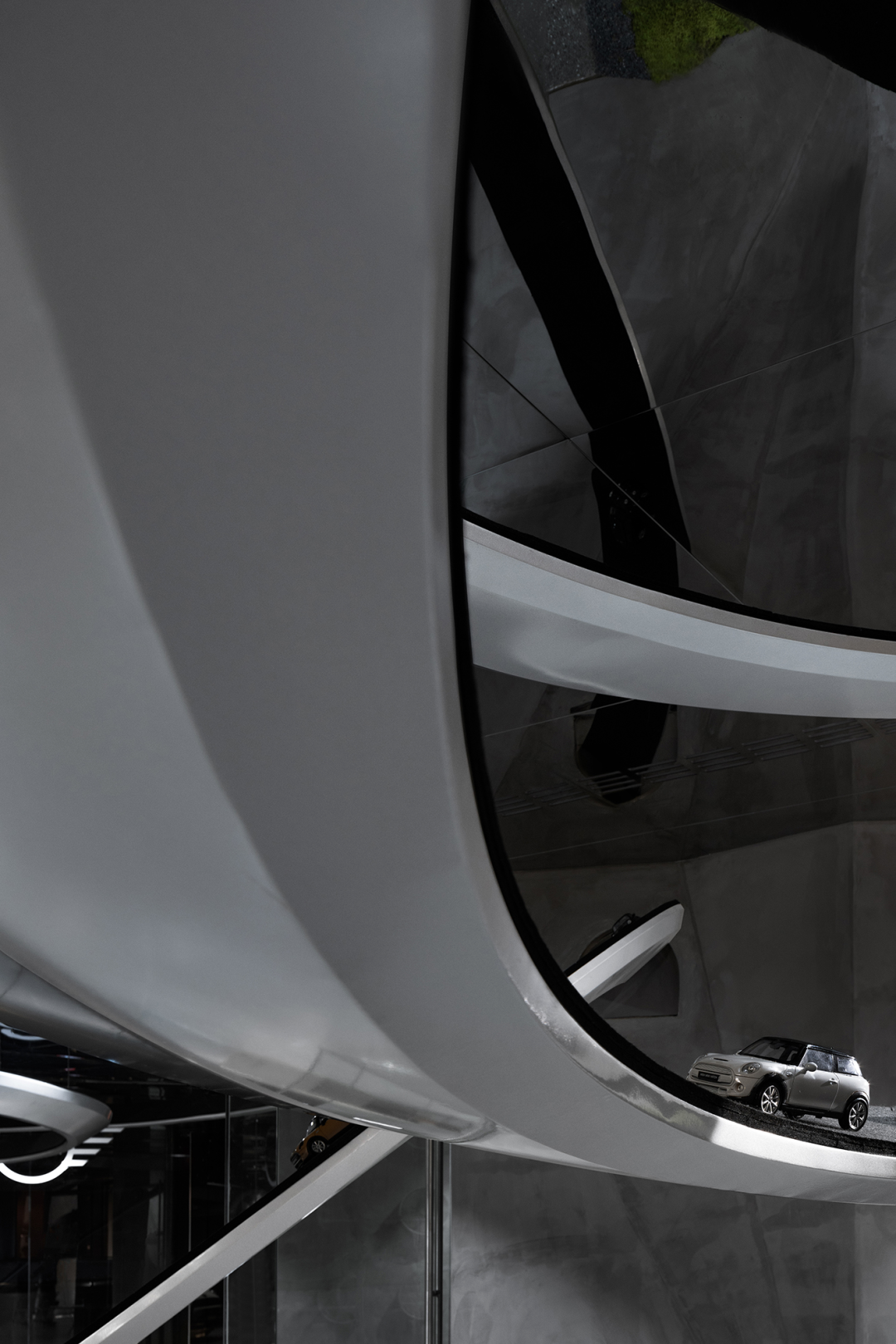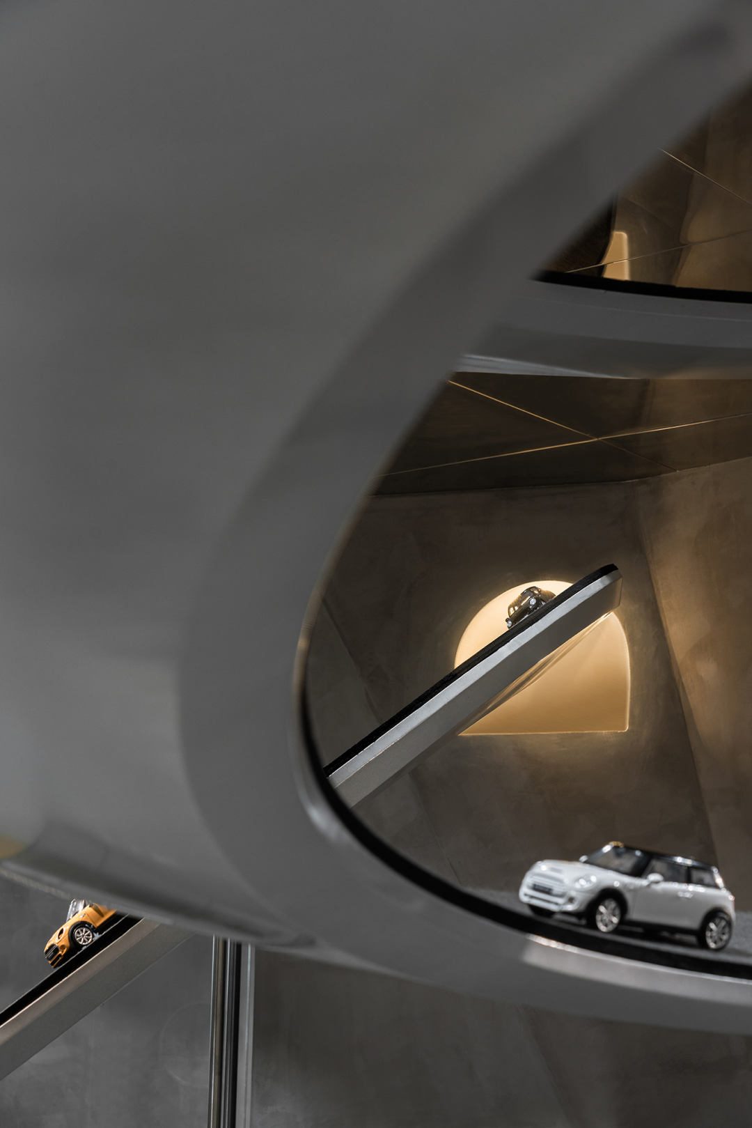 在MINI品牌展厅中,跑道是一个非常独特的设计元素,旋绕在整个空间中,体现出品牌的“自由自在”的精神性追求。设计团队在前期需要进行模拟,以确保跑道与汽车动线不冲突,并且跑道的高度和走向也需要满足汽车的挪动需求。此外,跑道还需要在视觉效果上带来一定的效果,增强空间的动感和张力。通过精心的设计和施工,跑道成功成为了品牌内核理念的有形载体,为展厅注入了强烈的动态属性。