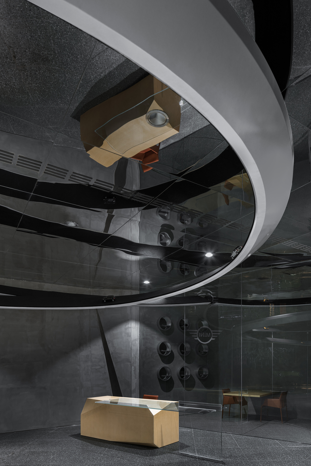 MINI品牌一直以来推崇的是不同个性的共同融合,旨在以自由和突破来打造品牌形象。基于这个理念,打造的“MINI”展厅是一个嵌入玻璃盒中的空间,拥有两个入口,一个位于商场主要入口,一个位于外街道入口。展厅内设有接待台、销售办公室和客户洽谈区。墙体上还设置了一个区域,供MINI车主分享他们的旅行照片。这一设计展现了品牌追求差异化、潮玩和共生共荣的品牌形象,将MINI世界的精神内核与展厅空间的环保可持续设计策略融为一体。