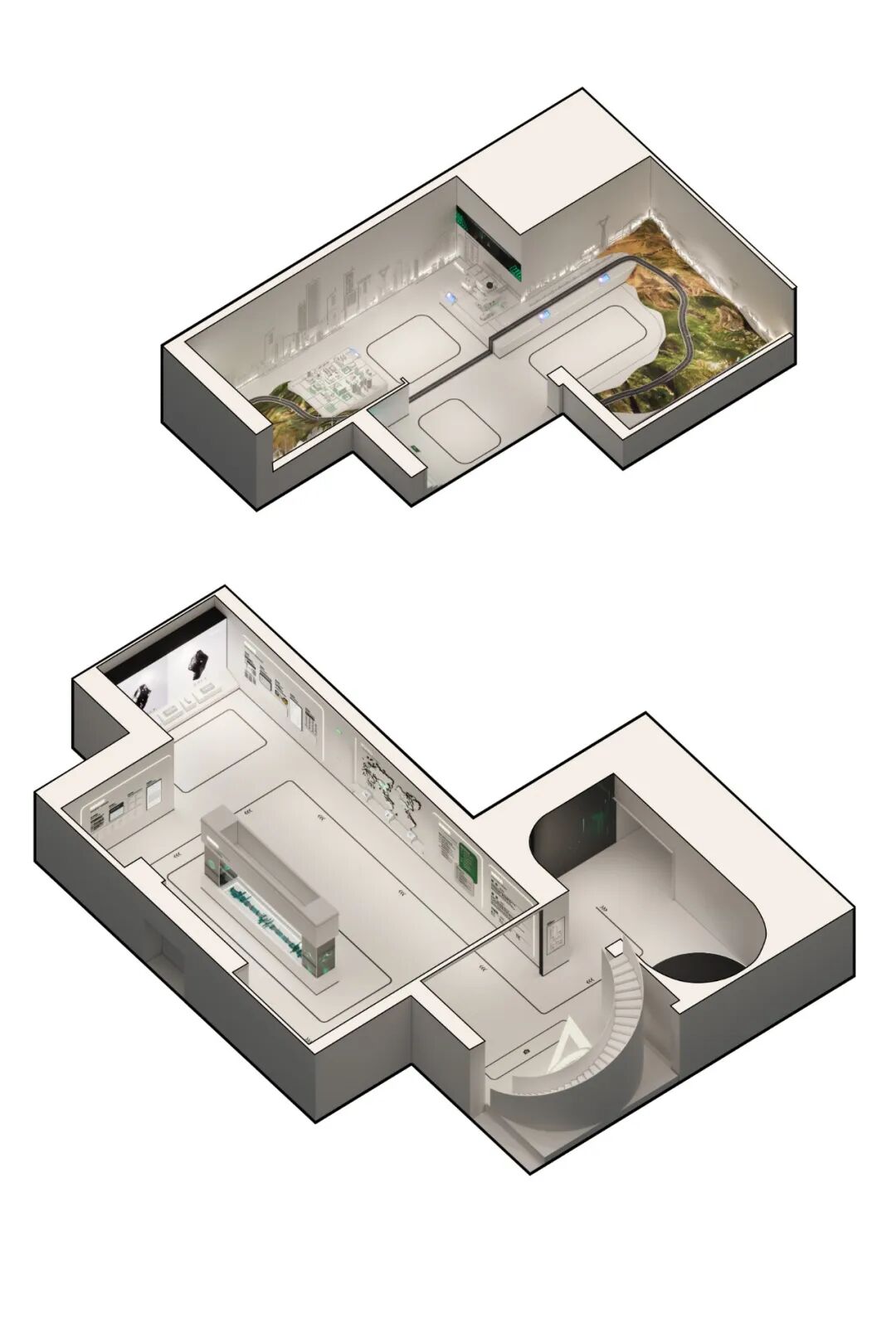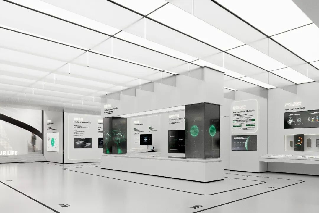 本次展厅设计项目的核心是“全场景绿电生态圈”的构建。展厅分为两层,总面积770平方米,以展示新能安在绿色能源领域的技术创新与发展历程为主线,设计不仅服务于品牌推广、实力展示和商务合作的需求,更通过全新的展陈理念,塑造了一个能够引发深刻思考、激发对话与合作的平台。