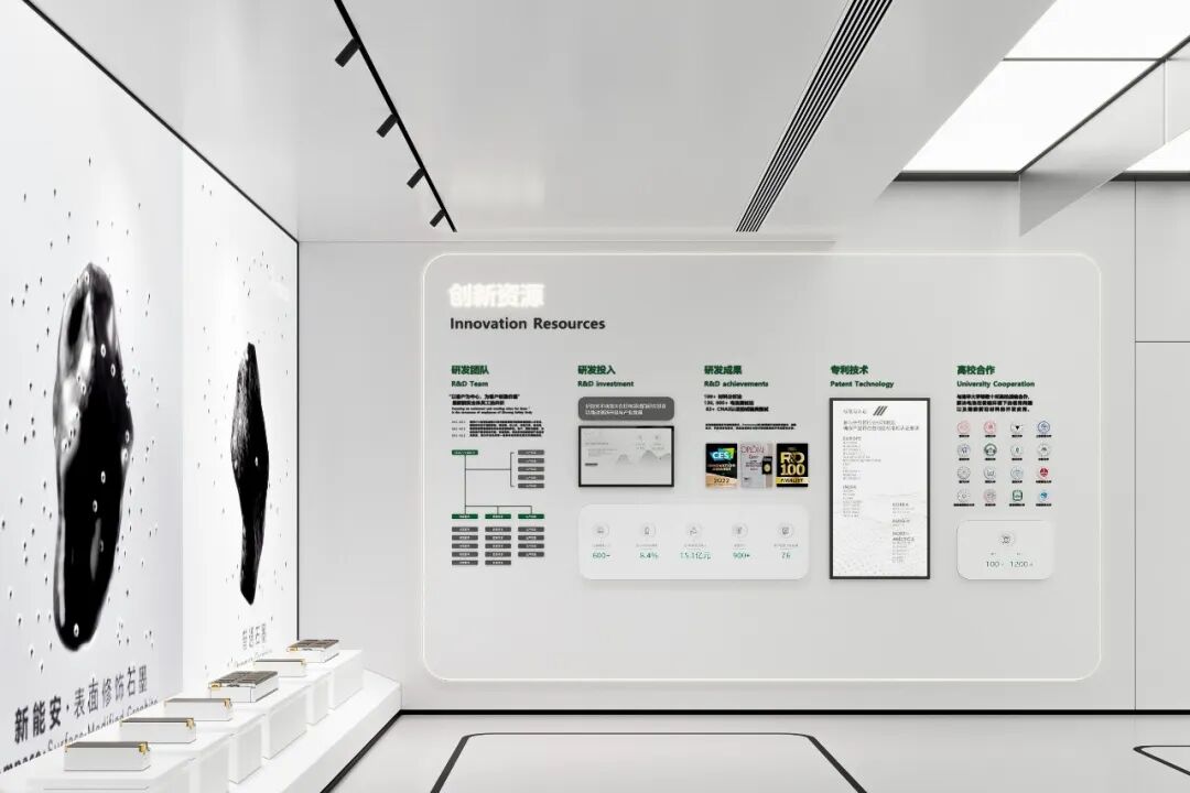 The design concept of the Ampace exhibition hall is "Exploration and Empowerment." Through the clever arrangement of the space layout, the exhibition hall becomes a dialogue space that spans across time and space, connecting the past, present, and future. The first floor is dedicated to "Exploring Inward," where it primarily showcases New Energy An's major breakthroughs in technological research and development, as well as product innovation. This section highlights how New Energy An leads the development of the new energy industry from a technological perspective.