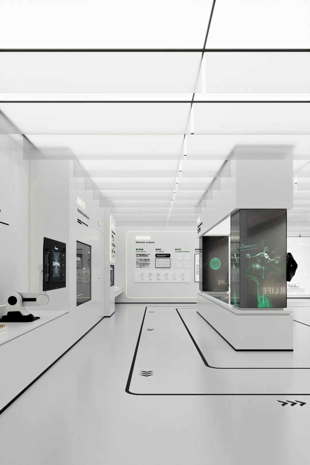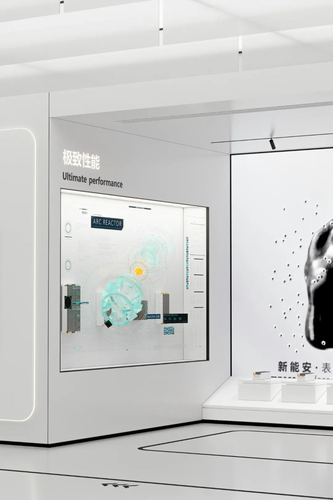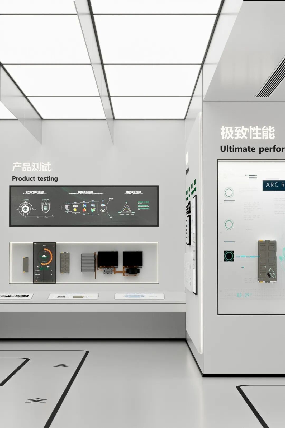新能安展厅的设计定位为“探索与赋能”,通过空间布局的巧妙安排,使展厅成为一个跨越过去、现在与未来的时间与空间的对话场。展厅一层是“向内探索”,这部分主要展示新能安在技术研发、产品创新等方面的重大突破,呈现新能安如何从技术层面引领新能源行业的发展。