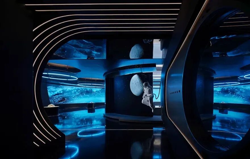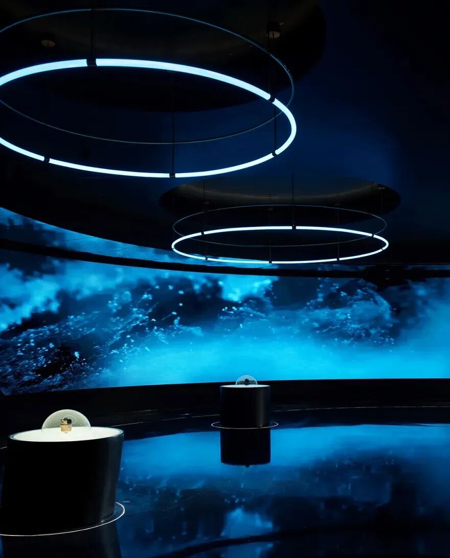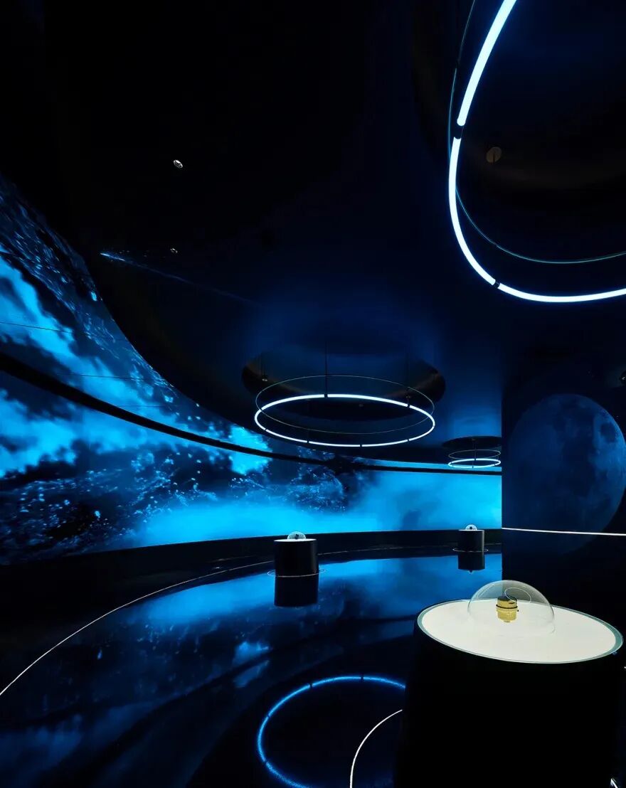 在中间核心的系统产品展陈中,运用多种播放媒体,巧妙地营造出现代感十足的场所氛围。这些元素不仅构成了原宇宙空间的重要链接,还赋予了装置艺术一种独特的表现力。