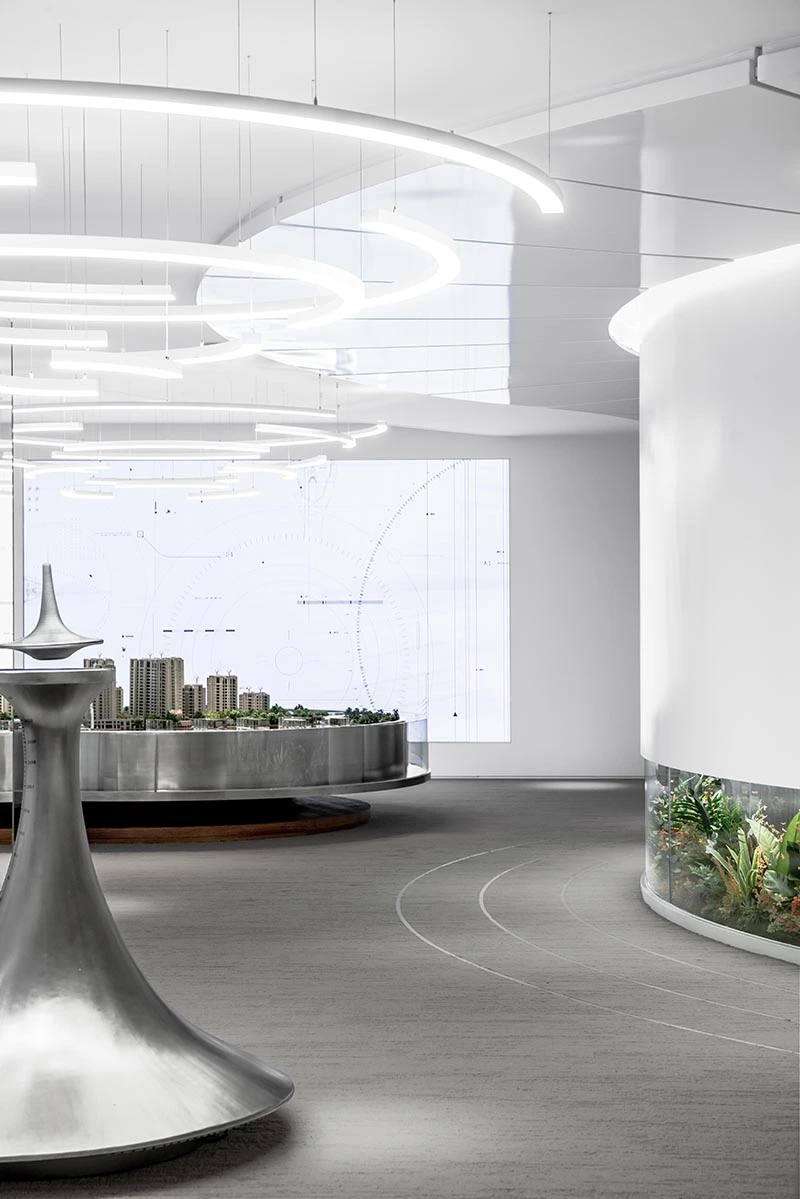 「时间的旋涡」主题装置是展厅的核心,其流线设计如水般流淌,与时间之海相融合,象征着城市与品牌文化的传承和积淀。同时,它也是未来的起点,代表着所有可能性的交汇。地面细节的流线设计,延续了整个空间的设计概念,使之更加完整。