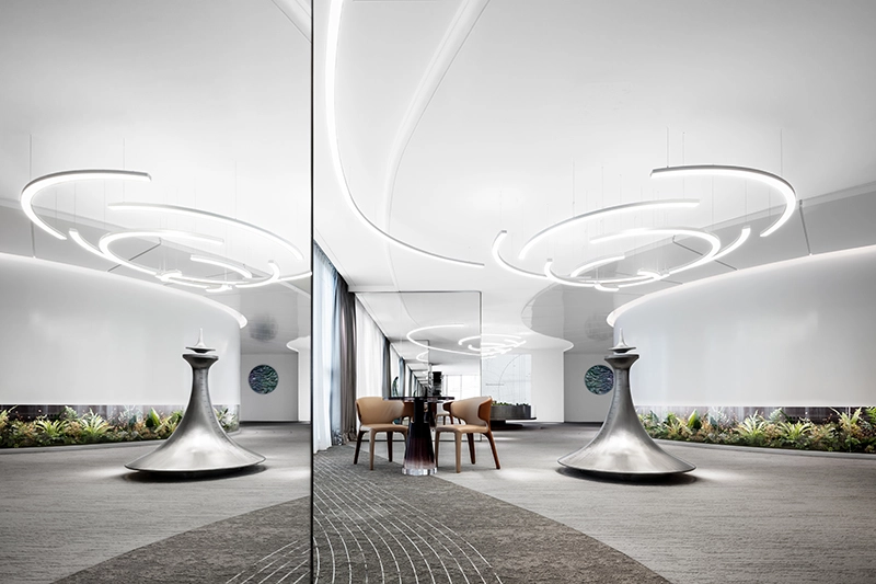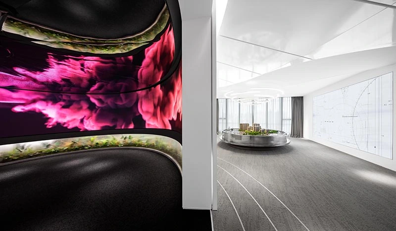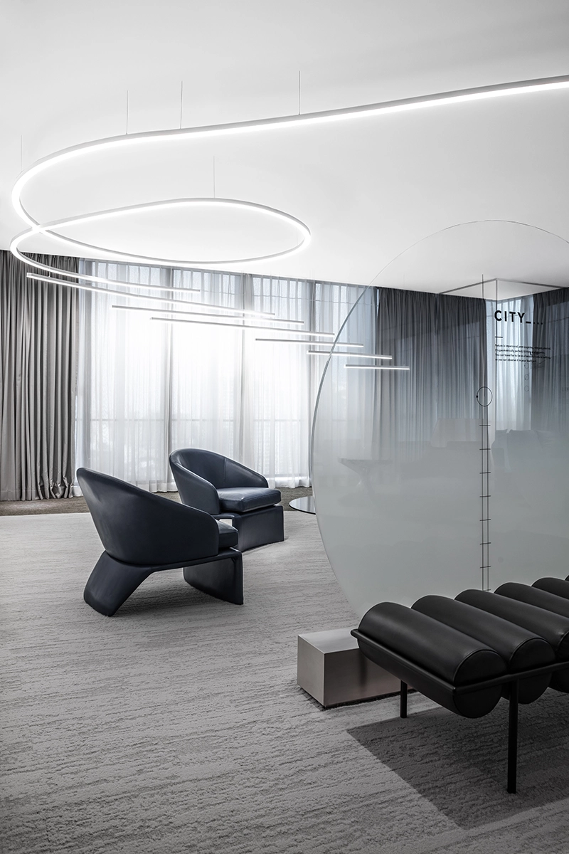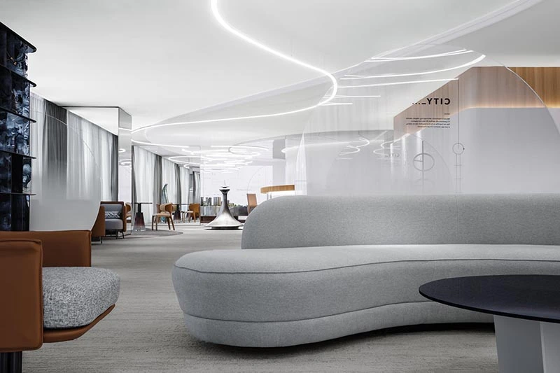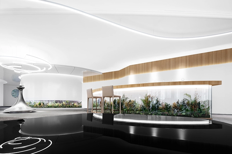中海汇德里是一处位于苏州河畔的展示空间,设计师的灵感来源于苏州河的水,将其融入展厅设计中。品牌方希望打造一处别具一格的展厅,不再采用传统的繁复装饰模式,而是创造一个能够深刻体验品牌精神的空间。然而,在500平米左右的空间内创造极致体验并非易事,因此设计师采用了极简主义的设计风格,并结合艺术装置、灯光和软装陈设等元素,打造了一个极具灵魂性的空间,展现出未来城市生活流线的美好愿景。