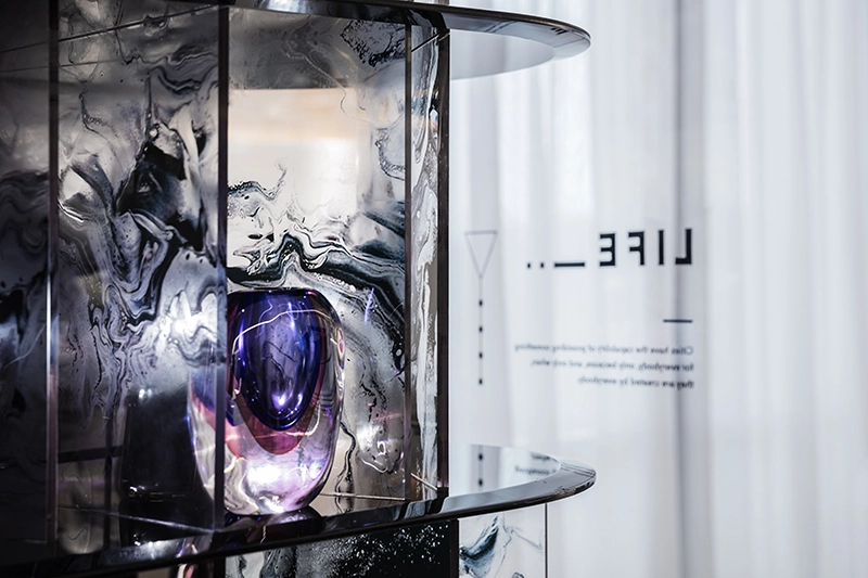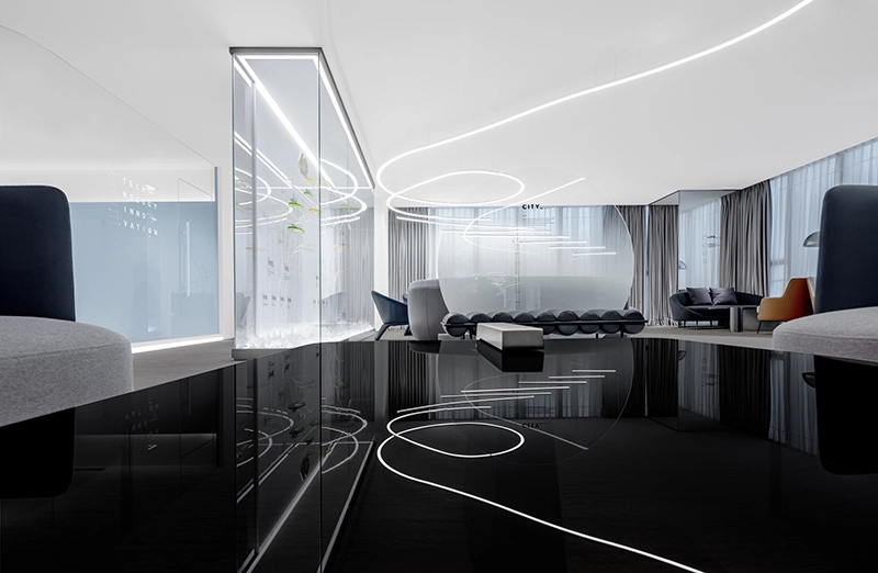 设计师巧妙地利用黑色和白色的主题色调,通过明暗的对比,将空间分隔出独特的节奏感和韵律感,为空间增添了更多的视觉效果和沉浸式的感官体验。玻璃围合的空间设计,使整个展示空间看起来轻盈而富有生命力,让来访者在这里体验到一场非凡的旅程。展厅的设计通过灵活的艺术灵感和城市元素的相互融合,打造出一个无限延展和变幻的城市艺术空间,为品牌的理念和形象注入了新的灵魂和生命力。