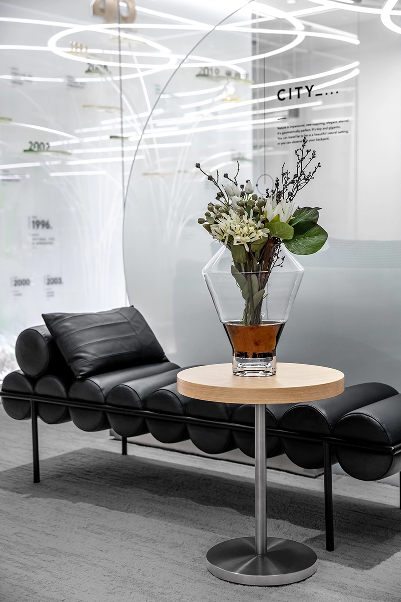 在空间设计中,确定边界是非常重要的一步。峻佳设计通过创造具有形式美的空间规划来加强整个空间的开展体验。入口区域采用走廊式设计,并加入了艺术装置,形成了一个狭窄的黑色空间,为整个空间的节奏和叙事带来了层次感和张力。
