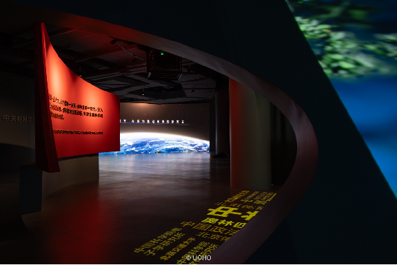红色的旗帜也起到了序厅到正厅之间路线过渡和转承的作用。随着人群的进入,扇形的展示正厅里,科技、恢弘的宣传视频逐渐开启,讲述一段引人入胜的发展故事。