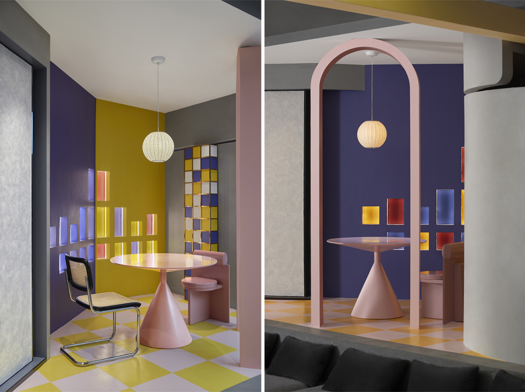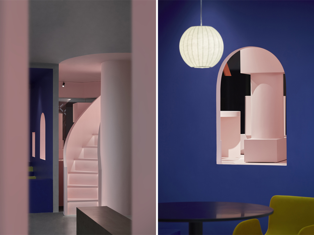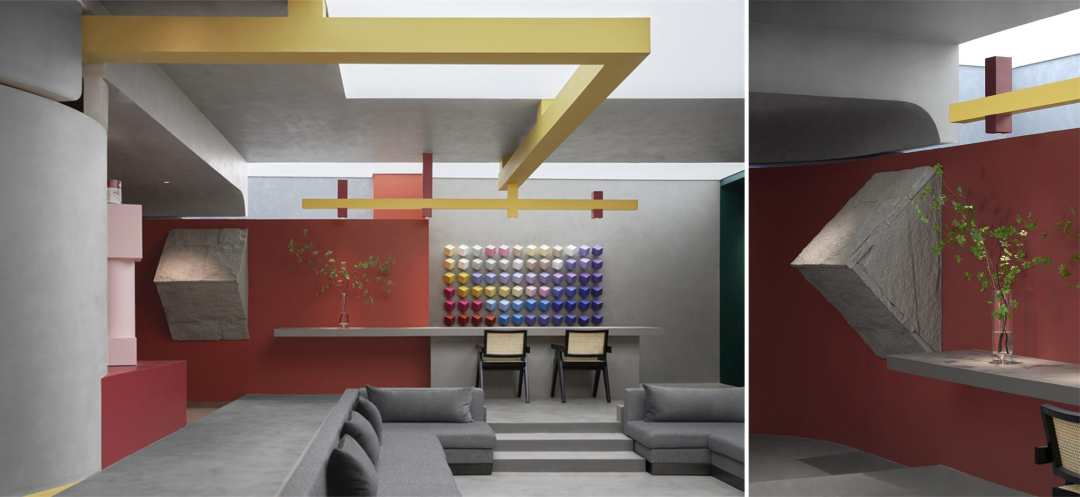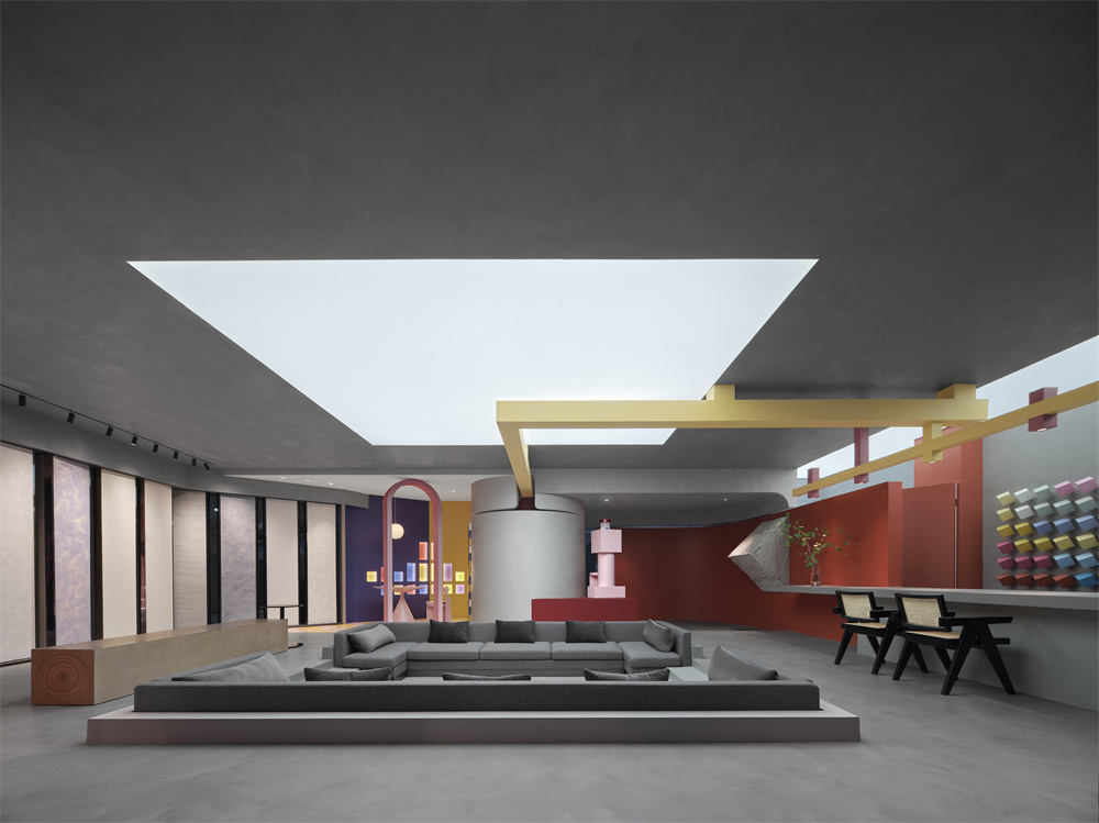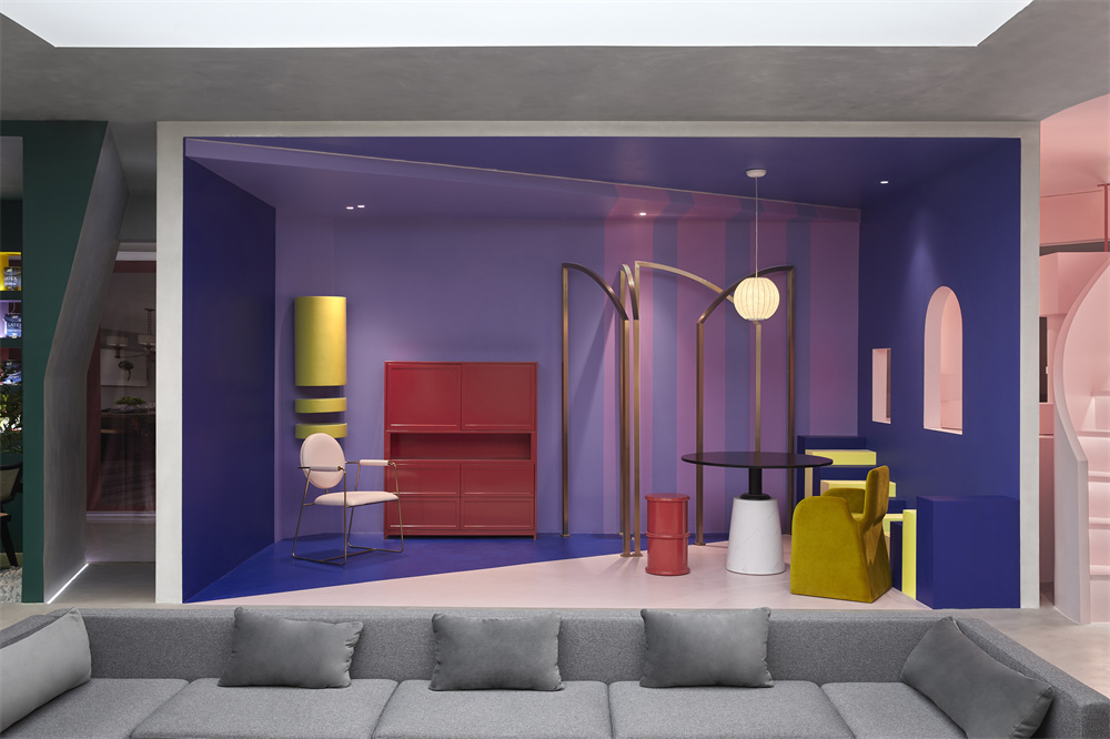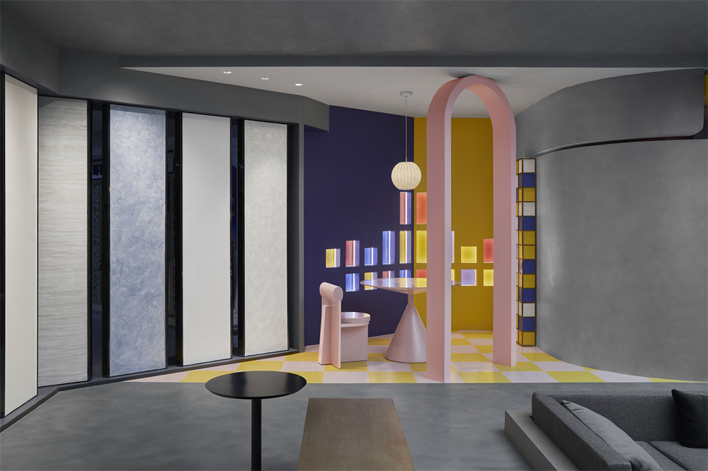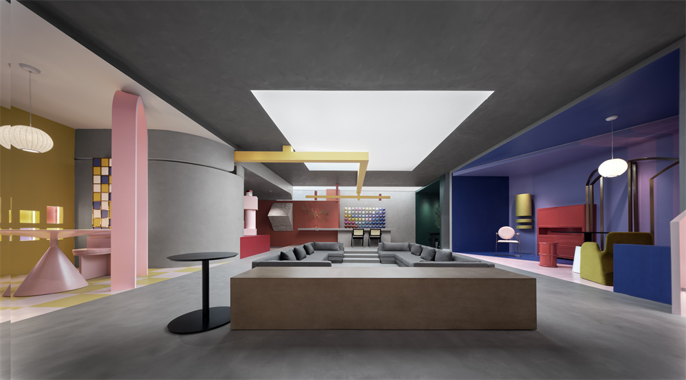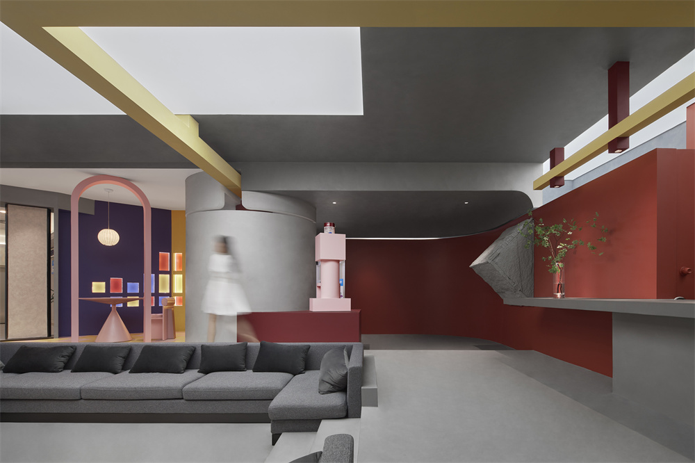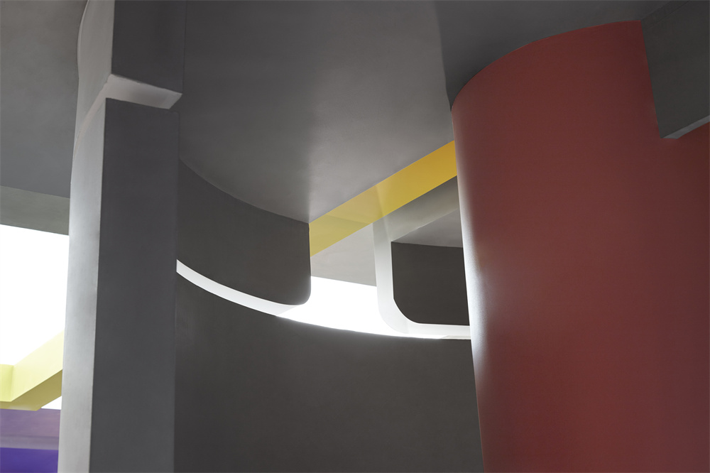 贯穿整体空间的微水泥提供了中性而沉稳的灰色基调,让缤纷色彩在空间内获得收敛与平衡,升华了整体空间的艺术感。摒弃了实体隔断,空间开阔性得到最大化的彰显,但也可能因过于直白,丧失了空间的婉约与丰盈。设计师通过各种形态的门洞,在规整秩序的空间中,偷出一条条错综而又隐秘的轻盈通道,彻底激发空间活力。