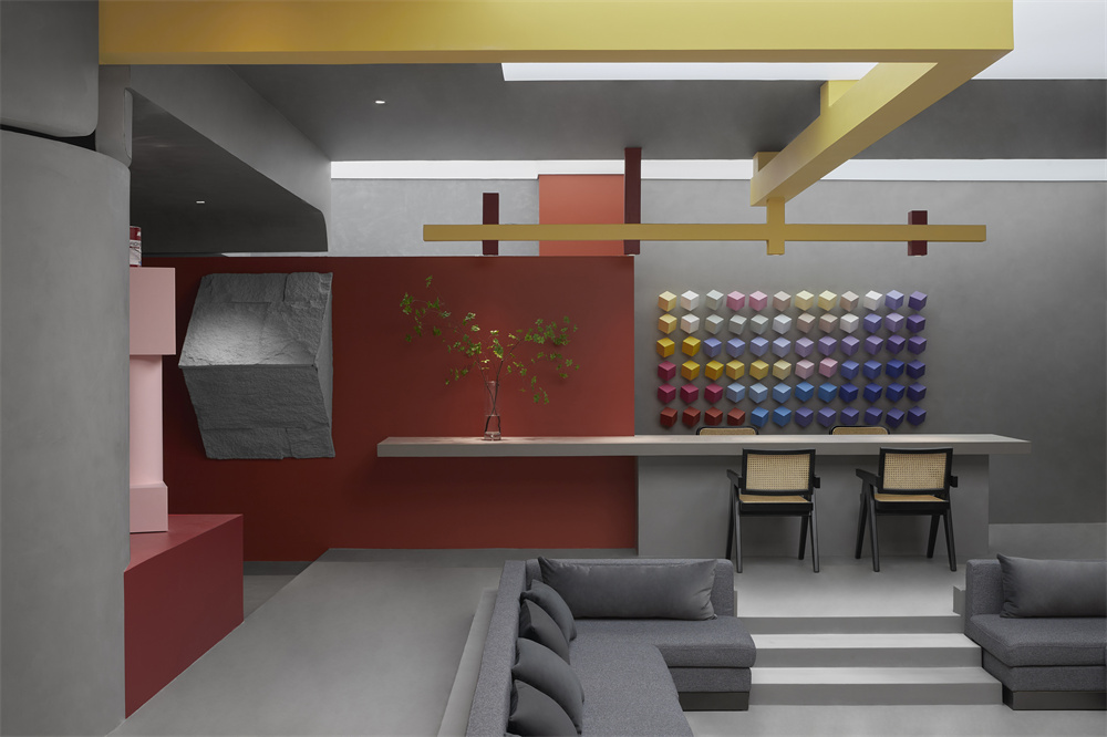 前台的魔方背景墙,仿佛一幅现代主义装饰画。空间内容主题的色彩属性、结构主题的魔方属性,在这里得到最浑然天成的交织与对话,一切都那么优雅而内敛、润物细无声。
