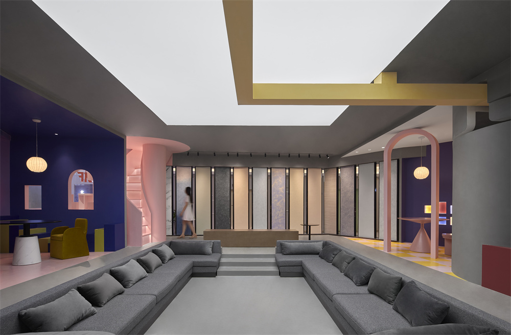 五阶结构贯穿整个空间,消解了场内的墙体,创造了一种形而上学的隔断。这不仅划分出相对独立的功能区域,使展示区变身为一个备受关注的剧场,将焦点聚集在局部之美上;同时,也让身临其境的观众能够尽情欣赏到开阔的视野,感受到空间的宏大和无限可能。这样的设计巧妙地将功能性与观赏性相结合,营造出一场丰富而开放的空间体验。
