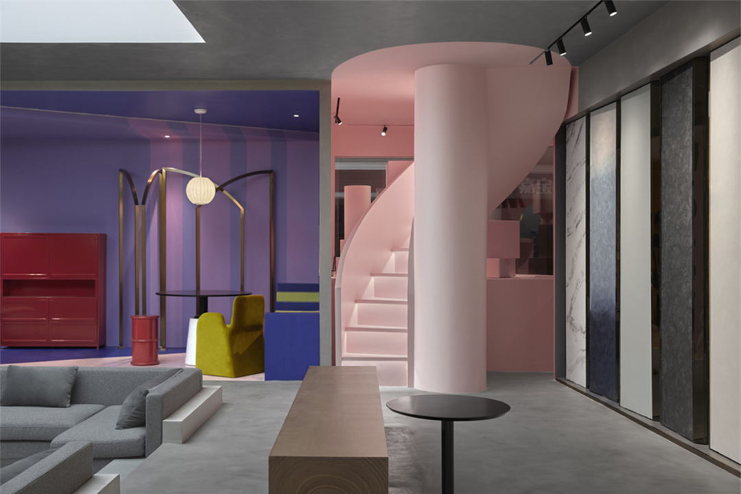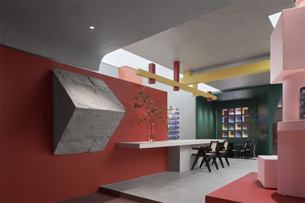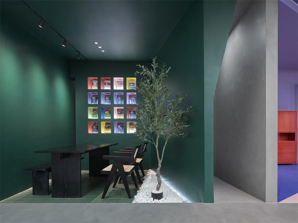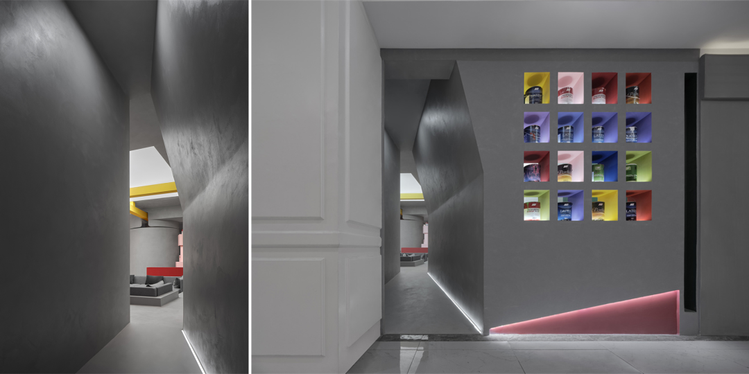 展厅另一处隐秘的入口,提供了类似的、饶有趣味的空间体验。狭长而不规则的走道,外宽内窄。误入桃源秘境,仿佛若有光,勾引着旁观者的窥视欲。设计师深谙园林造景的精髓,微水泥压低了走道的整体亮度,让空间内的饱满色彩与敞亮的天幕得到最大化的展示,路过的人都忍不住一窥究竟。