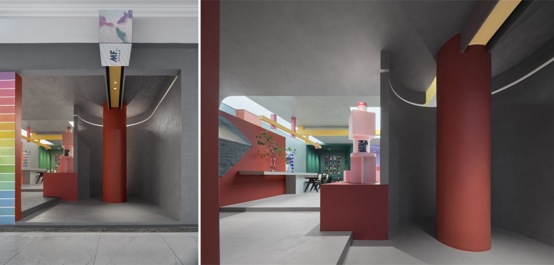 斜切对角蕴含着巧妙的设计思维。在展厅门口,通过天幕模拟自然光为绿植提供氧气,突显了品牌的环保属性;同时,利用视觉原理在圆弧墙面上创造出的效果,使色彩丰富的品牌墙仿佛从平行走道中跃然而出,引起观者的好奇心,同时创造了引流的价值。另一侧的切角设计了广角橱窗,展示了几何艺术装置,提升了品牌的潮流感,同时淡化了商业属性。这种精心设计的细节不仅强化了品牌形象,还为观众创造了更加丰富和引人入胜的空间体验。