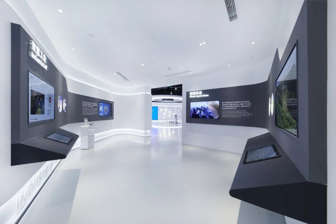 The overall space of the exhibition hall is open and flowing. The clear moving line plan helps people to visit in an orderly manner in order to obtain effective data and information. The smart life exhibition area depicts the minimalist and aesthetic characteristics of the space through color, material and shape. Entering the smart agriculture exhibition area, the color ratio has gradually changed. A large number of black appear to express the solid and stable characteristics of agriculture. The streamline shape intersperses the space boundaries with each other to form a relationship with each other, so that the space achieves a visual and perfect display. The important application of wisdom in industry and agriculture.