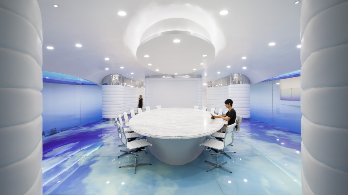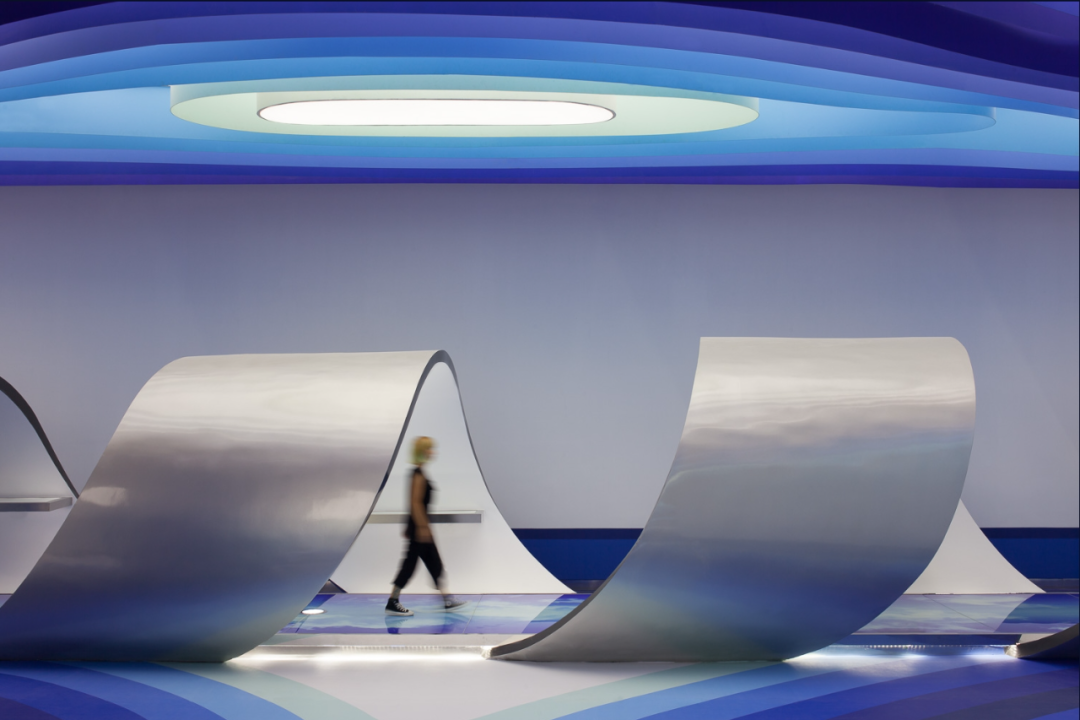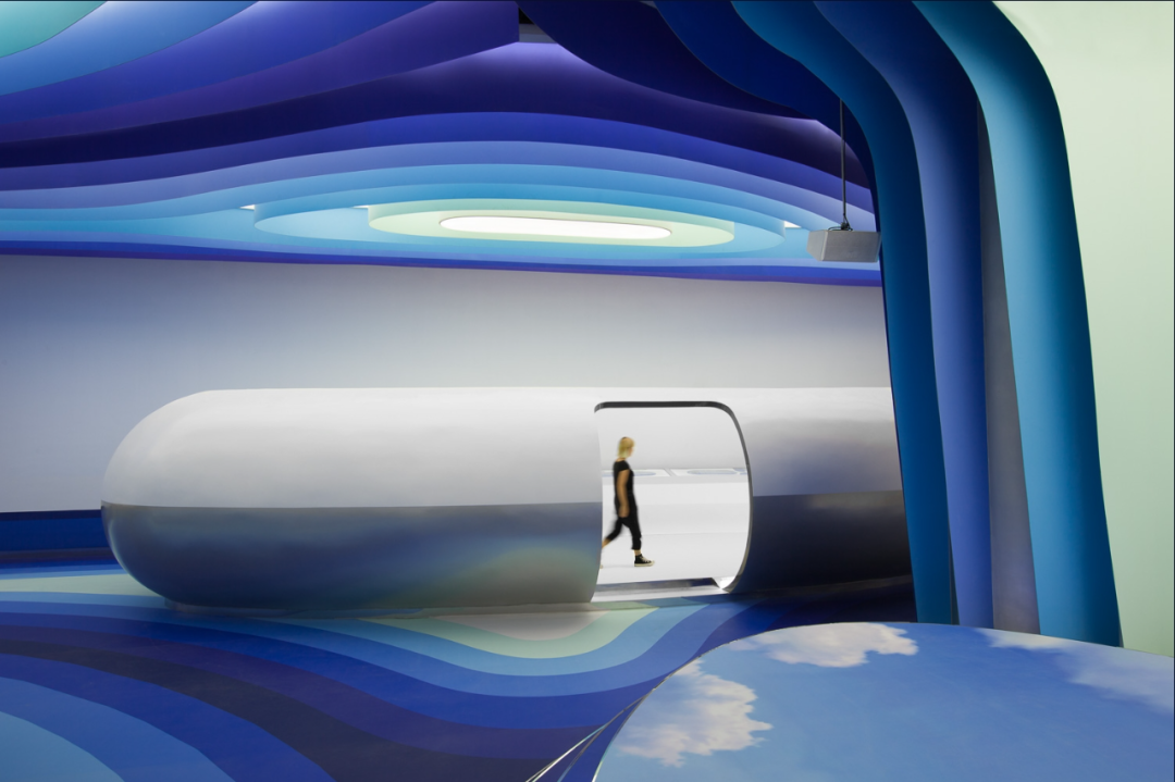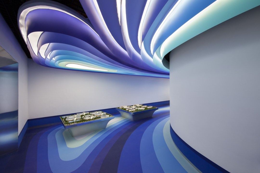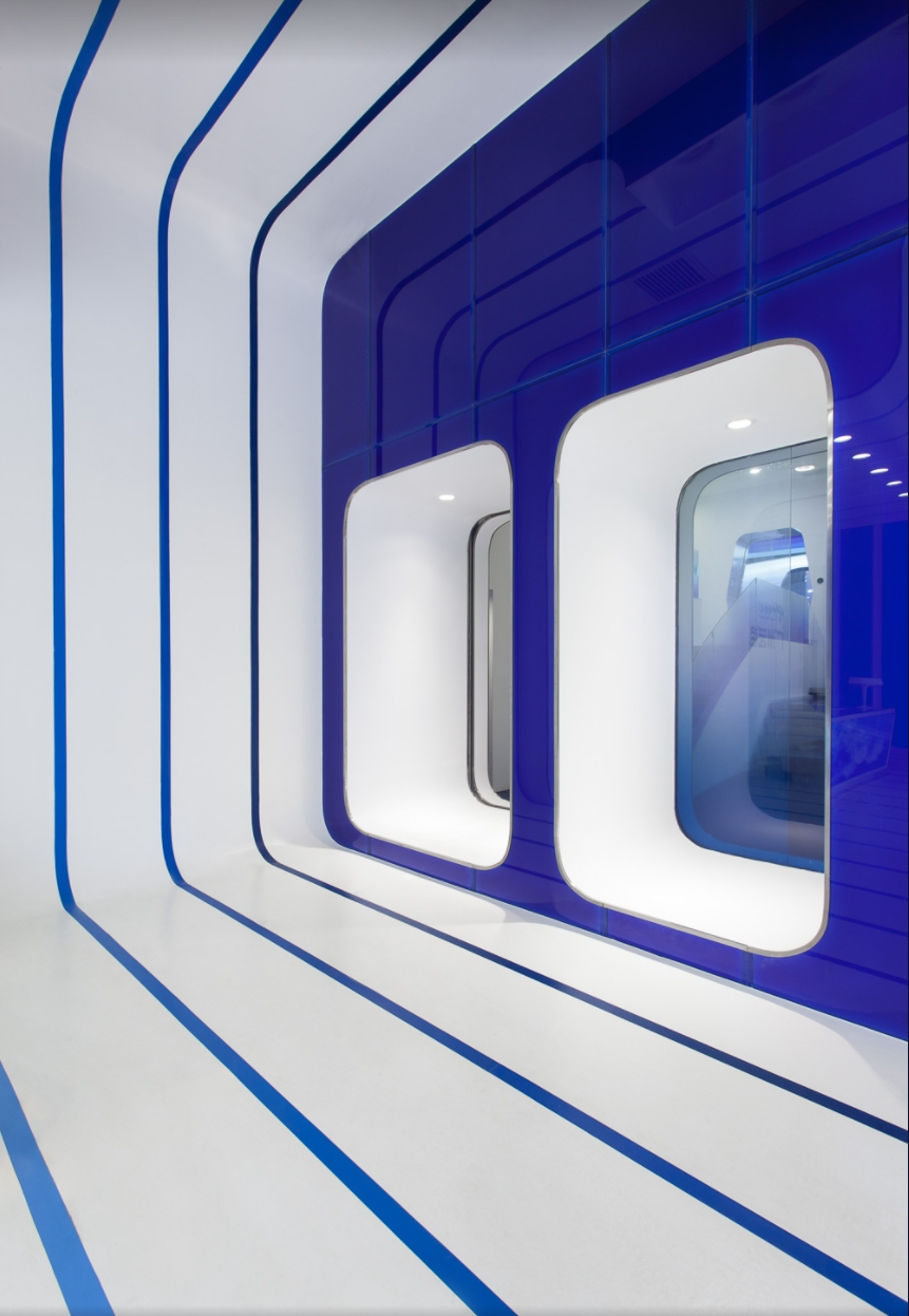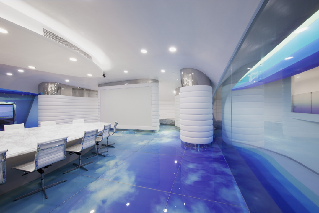Considering the name of Cloud DCS company, the theme of this project is about an image of a cloud that contains knowledge brought by the wind, defining layers of gradually fading blue tones in the sky to depict today's digital communication. The fluidity and dynamism of clouds formed by wind are expressed through a 30 meter long layered ceiling sculpture, which is a microcosm of digital communication in space and highlights its non-material but powerful properties. The characteristic of this ceiling is made of metal profiles painted in seven blue gradients, covered with Barrisol's elastic fabric and illuminated by neon lights. The intricately carved artworks defined by the ceiling are reflected onto the floor, like a huge oil painting printed on resin, giving people a feeling of walking in the sky.