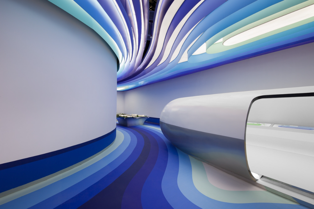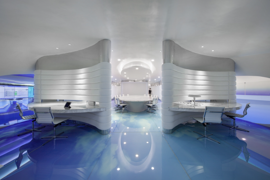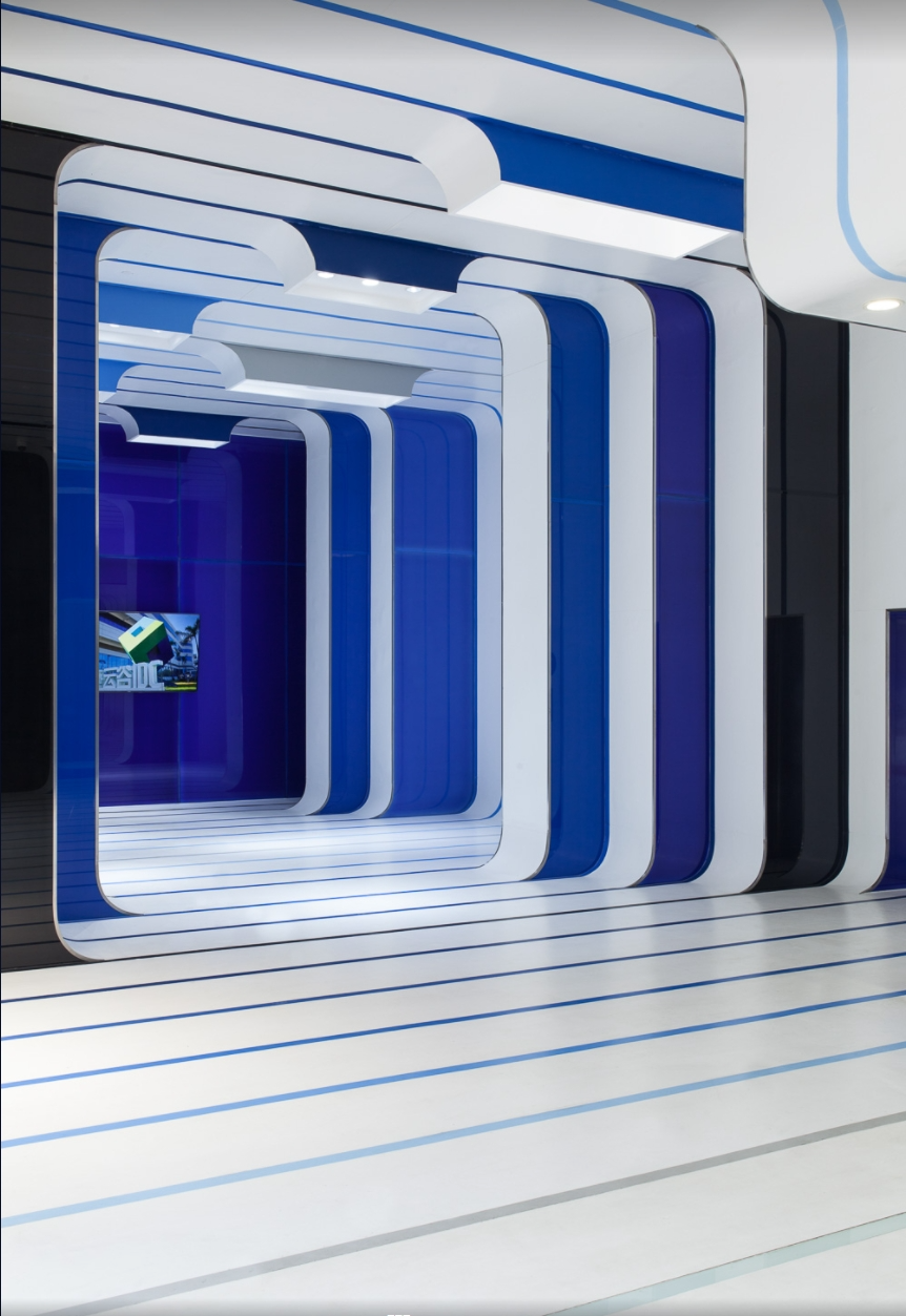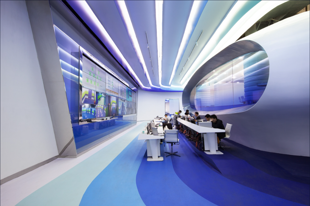 All interior design colors are pure white and seven tone blue: these colors define the brand identity of the logo and artwork. However, most design features are designed to create an intangible and positive atmosphere for visitors to experience simultaneously. A new concept of factory has been proposed within the data center: why not develop the cooling pipe room into a concept? The intricate design of pipes painted in different colors balances the digital artwork printed on the wall. The theme of the project is to transform the factory from a sad, oppressive, and efficient place to a happy, positive, and efficient place.The corridors between data centers are defined by artworks, colors, and graphics, implying the concept of crossing the sky. The purpose of the break time and some typical floor planning projects in the leisure field is to introduce an objective and happier workspace into the atmosphere of "work and life" that may be first seen in Chinese factories: for some notorious American headquarters, the development of the office atmosphere has shifted from a serious and corporate perspective to an informal, cool, and more humane atmosphere.