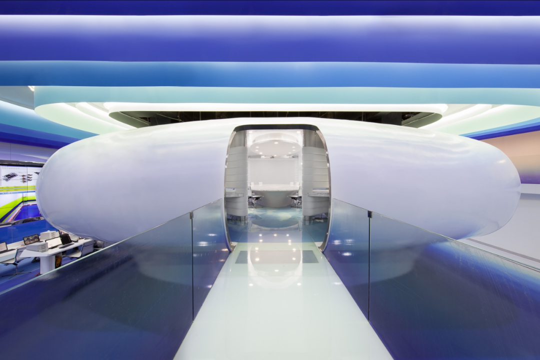 所有室内设计的颜色都是纯白色和七色调的蓝色:这些颜色定义了标识和艺术品的品牌标识。不过,大多数设计特色都是为了让游客同时感受到一种无形和正能量的氛围。在数据中心内部提出了工厂的新概念:为什么不把冷却管房发展成一个概念呢?画有不同颜色的管子错综复杂的设计与墙上印刷的数字艺术品相平衡。项目的主题是将工厂从一个悲伤、压抑、高效的地方转变成一个快乐、积极、高效的地方。数据中心之间的走廊由艺术品、颜色和图形定义,暗示了穿越天空的概念。休息时间以及一些休闲领域内的典型的地板计划项目的目的是将一种客观工位更快乐的工作空间引入可能首次在中国工厂的氛围“工作和生活”:对于一些臭名昭著的美国总部的公司办公室的氛围的发展从一个严重的和法人的看着一个非正式的,酷,更人性化的氛围。