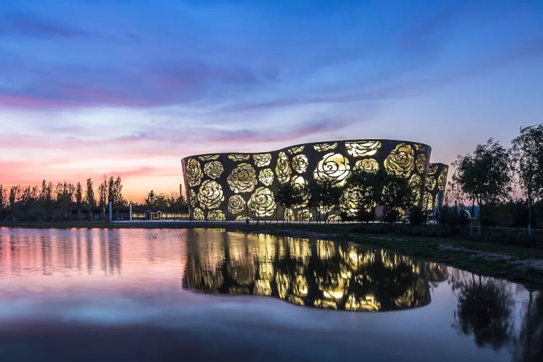 月季博物馆(The Beijing Rose Museum)坐落在北京的大兴区,总建筑面积约为17000平方米。以带有中国传统月季纹饰的丝绸为灵感,用建筑的手段打造了一个丝绸般华美的、带有镂空月季花纹饰的外幕墙,并设计柔美的曲线以彰显月季的姿态,显得极为夺目,令人赞叹。