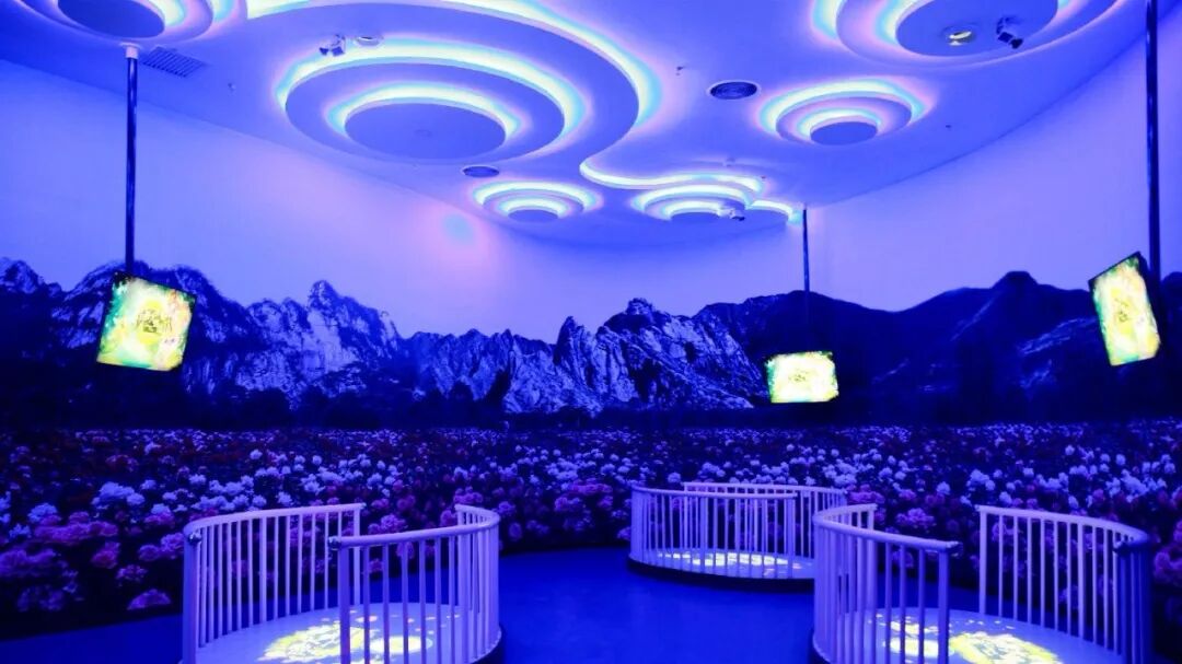 在环型互动演义舞台上,随着表演者舞动的姿态,无数色彩斑斓的花随乐起舞,让博物馆中的月季“活”了过来,花随人动更增添互动的乐趣。