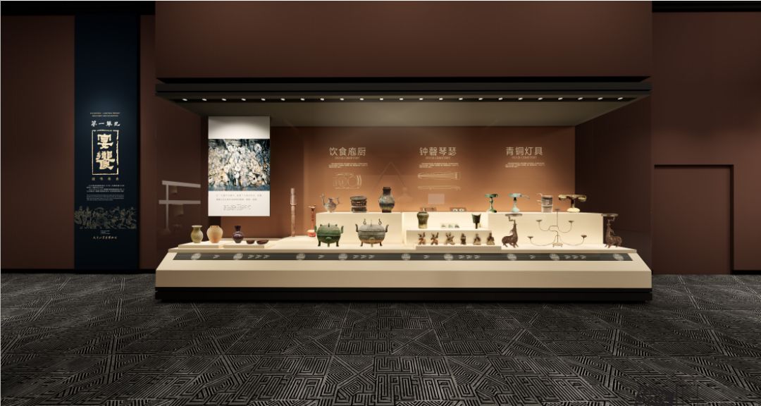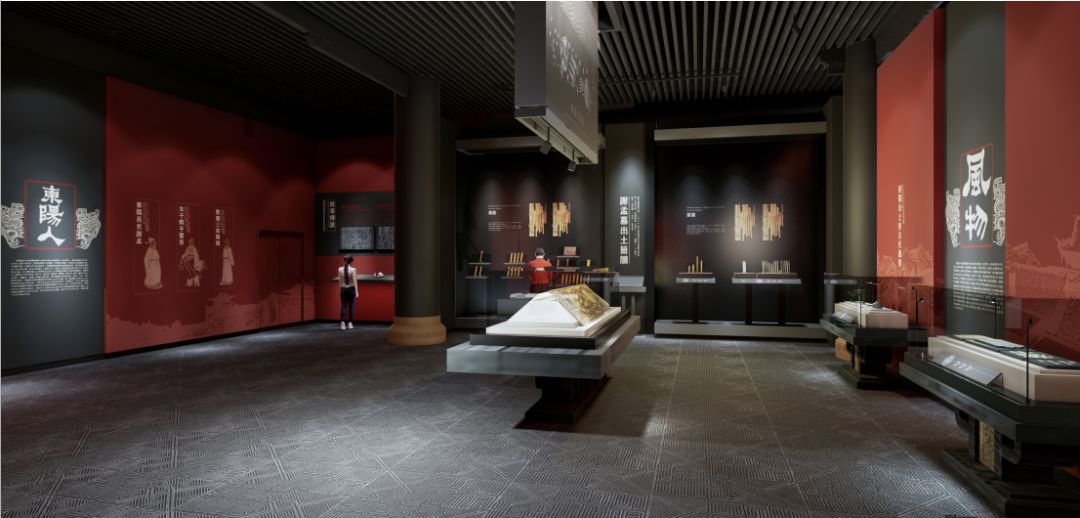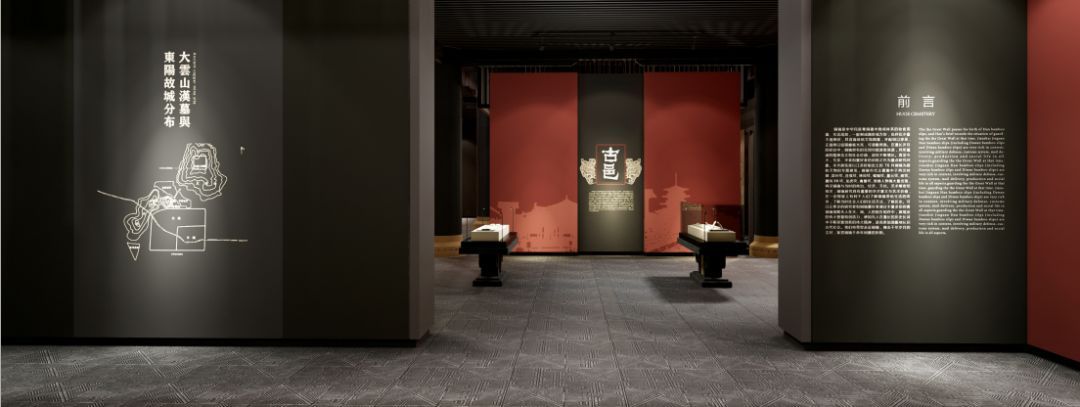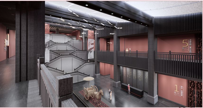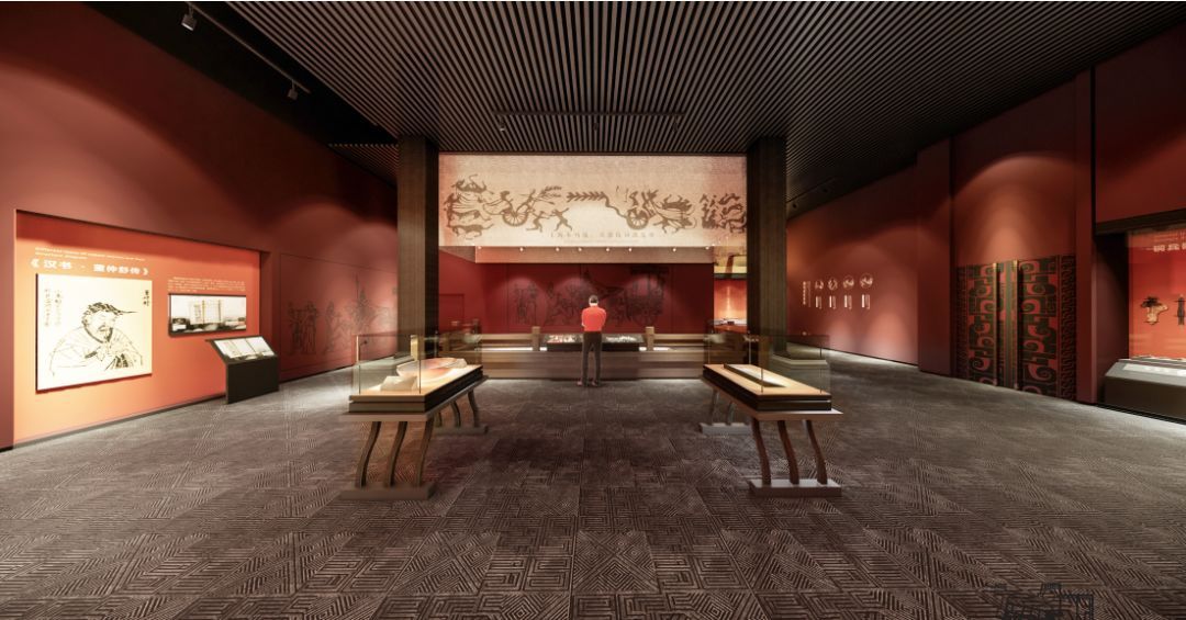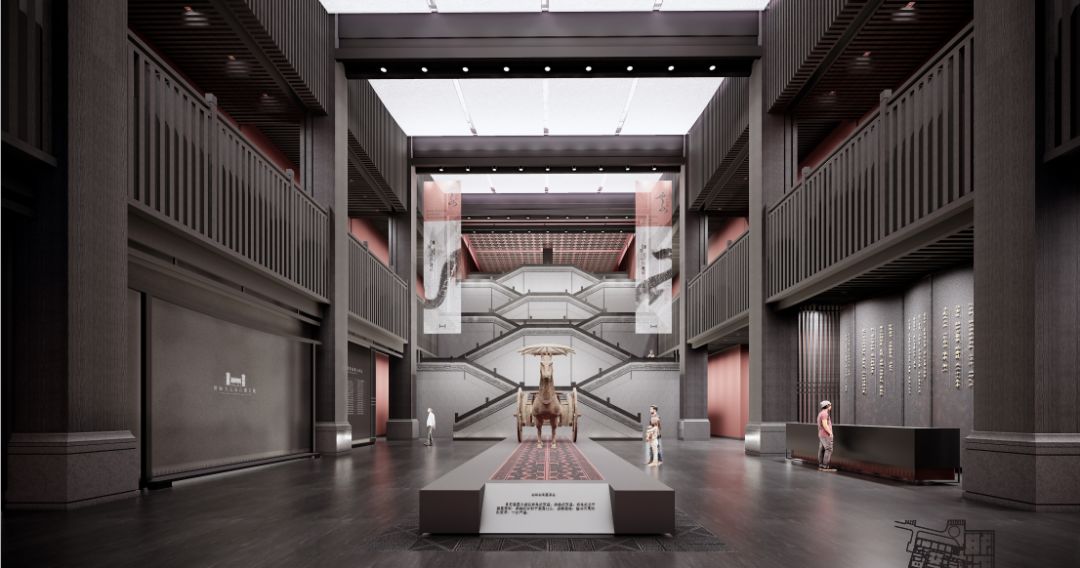 采用汉代最具代表的红、灰、黑色几种颜色进行空间上氛围营造,一辆铜车马位于展厅中间,仿佛迎面而驰,带领受众走进大汉鼎盛时期的时空。
