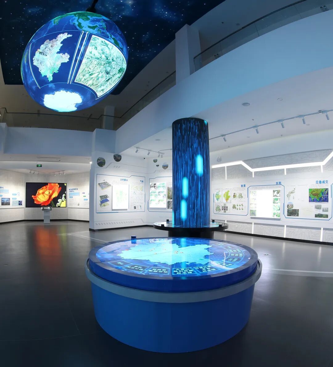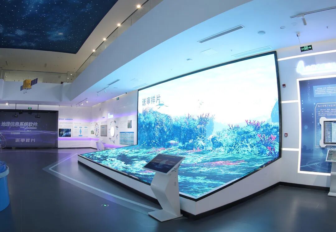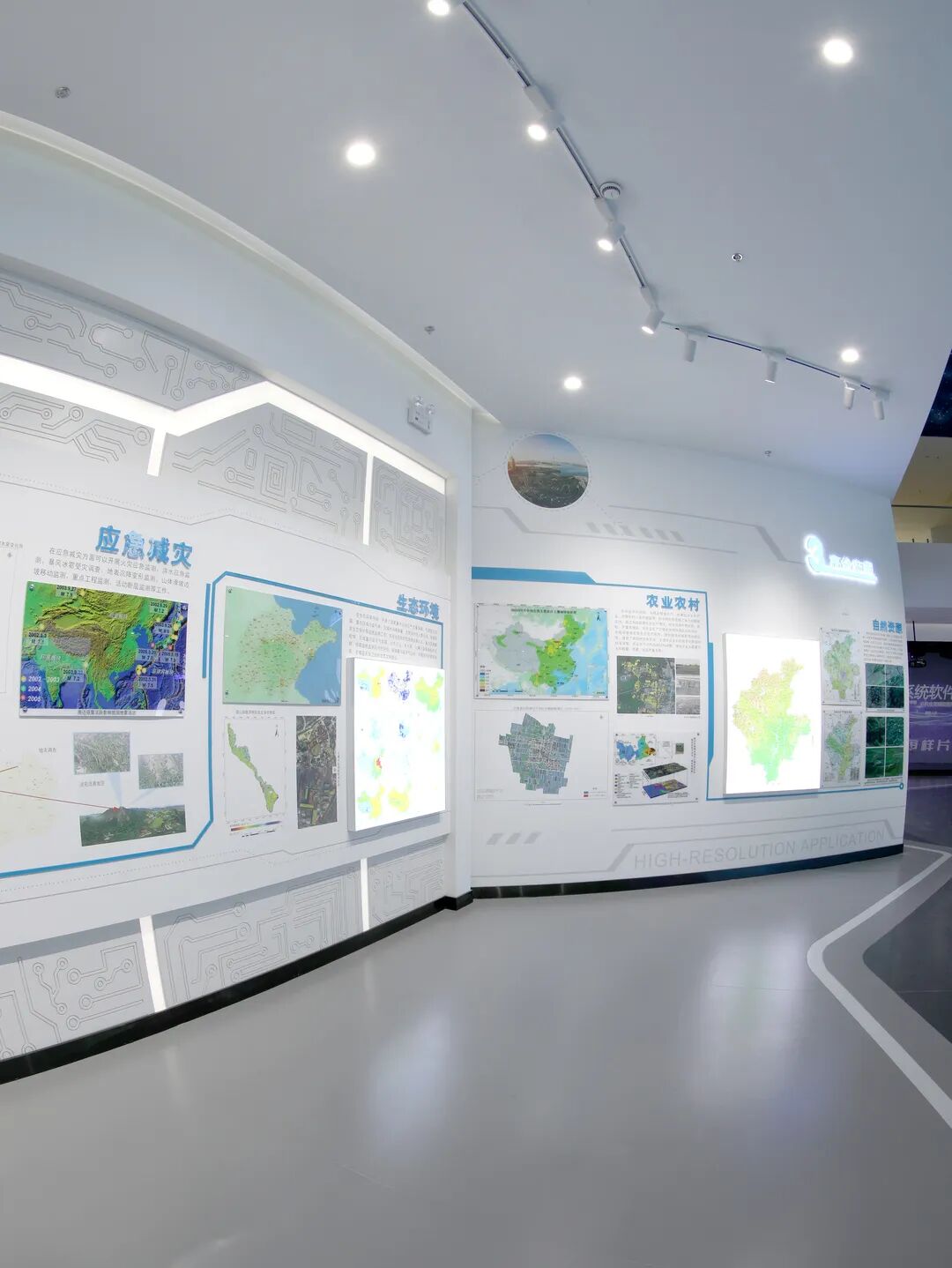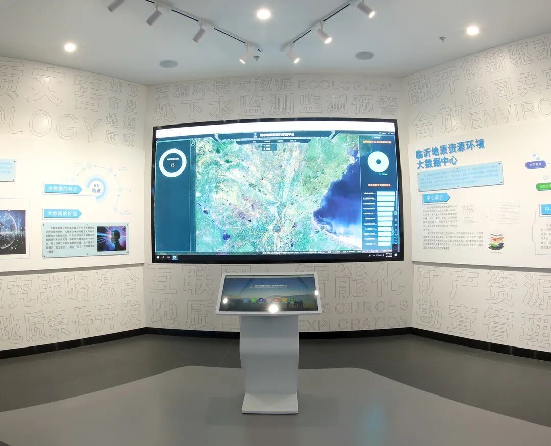序厅打造“空天地深新时代”形象墙,形成鲜明视觉印象;3S技术展区通过北斗定位系统与拼接大屏,展示地理信息系统应用与技术发展趋势;电子沙盘支持触摸屏互动,直观呈现国家高分专项工程及中心发展规划与应用前景。