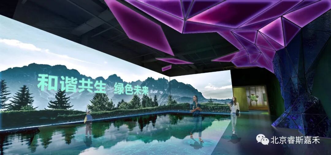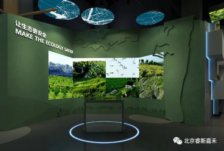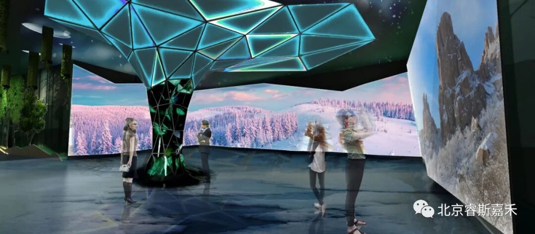 沉浸式观影空间效果 互动三折幕区域,接入大数据生态林业系统或卫星影像执法监督平台的实时画面,让观众身临其境,感受科技林业的震撼力量。