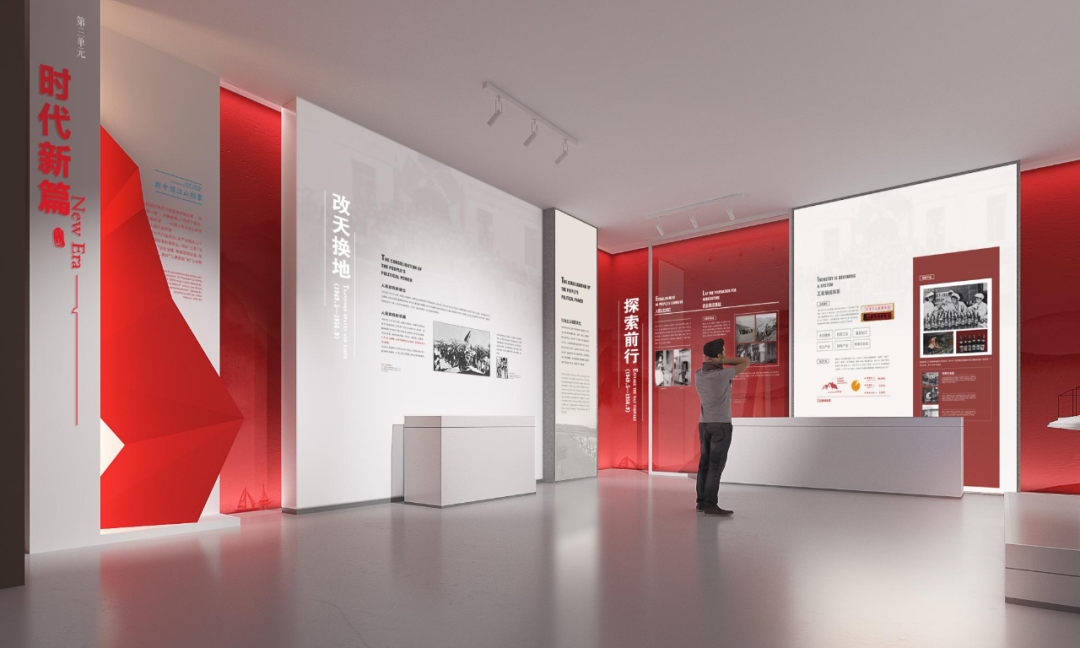 以奋进红为主色调,以色调的变化、顶天立地的展墙设计,突出时代的更迭与进步,见证江山自建国以来奋进拼搏、赶超跨越的壮丽征程。