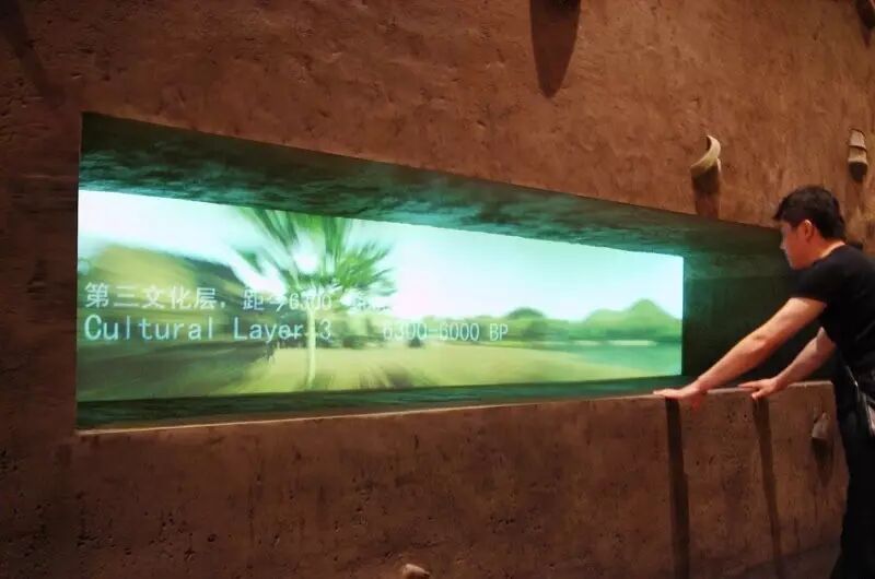 一个婉若现代主义风格的雕塑——“土方”矗立展厅中央。被“切开”的视觉感受震撼性的将河姆渡遗址独有的四个文化层展示出来。整个展示空间仿佛是一个展示现代主义风格雕塑的展厅,而“雕塑”本身又是一个被赋予考古学知识的科学模块。因此,我们说当找到好的结合点时,艺术形式与科学内容就不再是一对矛盾体,而是互为原由、相互依存的。“土方”这个简洁的艺术语言在这里更象是一把打开远古之门的钥匙。为观众开启了一扇远古之门。观众透过裂开的土层,寻着这些文明的印痕,实现了一次对数千年前先民智慧的回望!