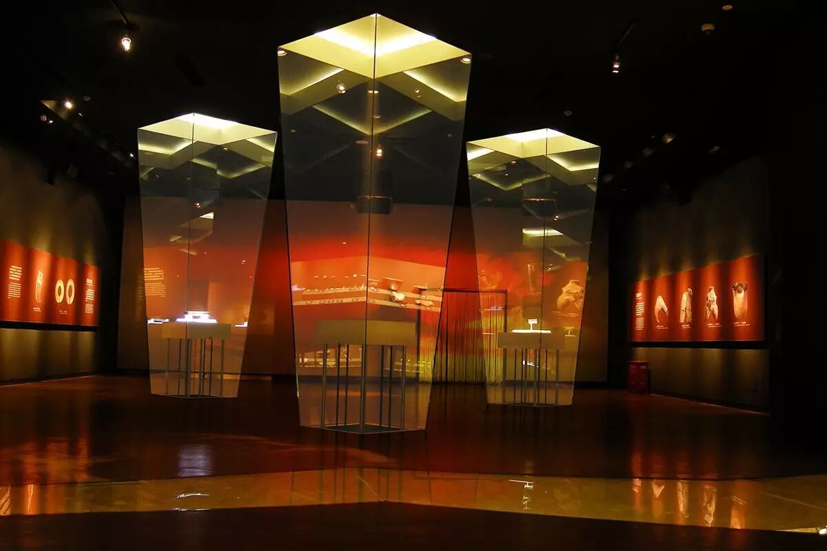 这里场景本身被视作一件巨大的艺术品。将先民生产生活的诸多情景整体置于一个巨大的土块当中,抽象的形态与具象的人物场景相咬合,单色雕塑的场景处理手法,视觉化的传达出一个凝固的时代、乃至一个世界,将“从一个巨大的土块中被挖掘出来”的设计理念。整个场景结合独特的色彩环境处理和创造性的绘画方式。创作出了一个史无前例的博物馆场景再现形式。强烈的色彩环境和单色的雕塑相融合,使展厅塑造出了一个“依稀、混顿”空间氛围,一个个单色雕塑仿佛一个个先民的影子历经千年栩栩如生。如诗如画、如画如歌,一部充满浪漫主义色彩的史诗在这里通过空间语言得到了艺术化的再现和演绎。艺术手法上运用了写实与写意的结合、具象与抽象的结合,通过驾御艺术自身的多种形式塑造出了这个协调中又有对比的场景复原。另外,值得一提的是我们采用了文物与场景对照展示的手法,将文物与场景融合在一起,而场景通过空间位置的塑造和单一色彩处理,真正使得场景成为文物的最好解读。生动、艺术的场景始终处于文物的背景位置,但又不失场景的恢弘和感染力。