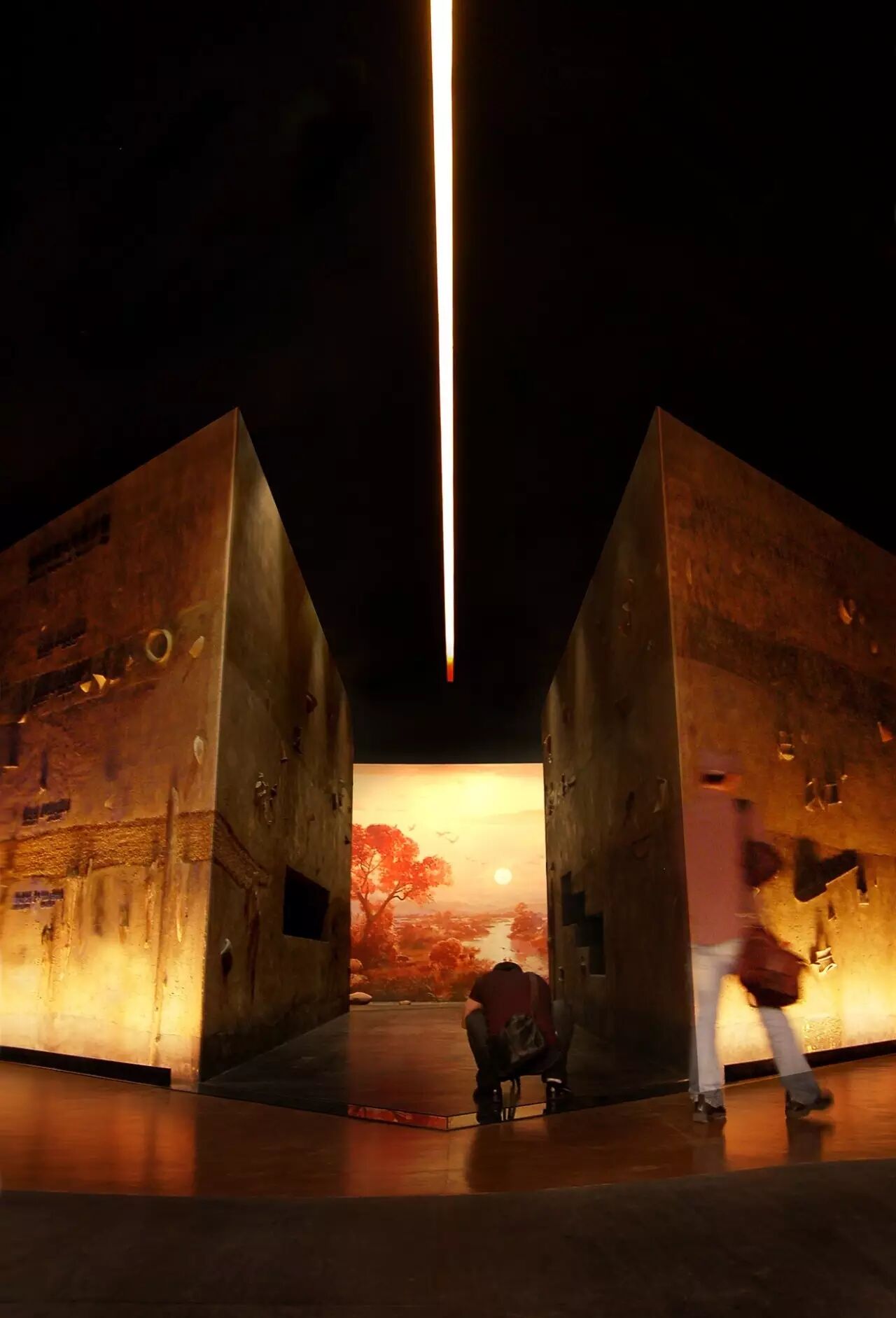 从一个现代主义雕塑的“土方”——到古典主义油画描绘出“伊甸园”般神秘、浪漫的世界——到凿开一个凝固了数千年混沌世界的巨型场景雕塑——再到如光如影器物展示的装置艺术——最后到动态影象与后现代主义设计手法相结合,塑造出的空灵、浩渺的心灵之声!一处处近乎纯艺术语言的应用,为河姆渡遗址博物馆陈列形式找到了一个博物馆陈列形式中前所未见的新方向。
