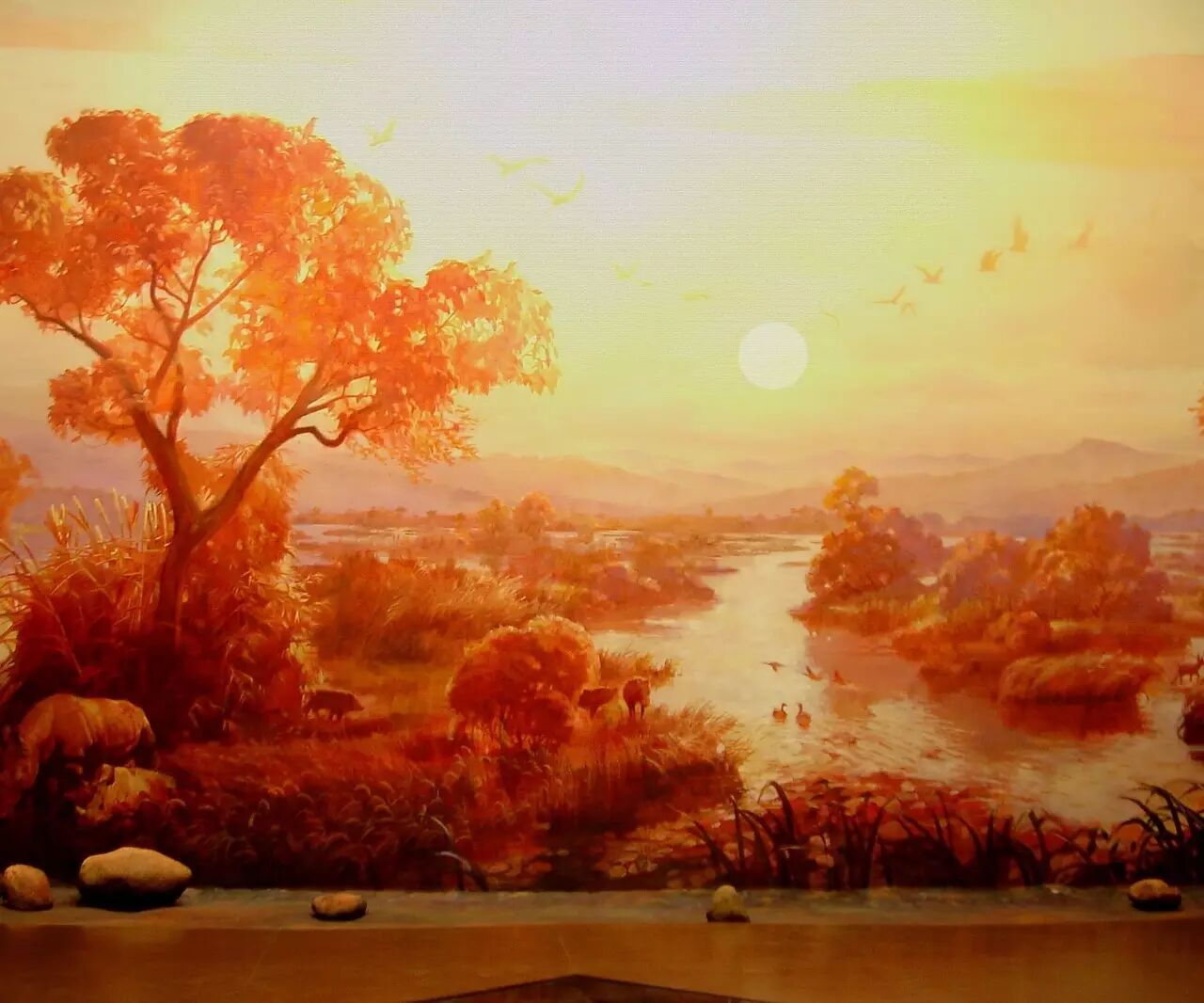 古典主义绘画风格的准确定位,再现出一个古老、神秘、“伊甸园”般的美丽世界。为避免国内博物馆常见的绘画表现手法带来的缺少时间感和距离感的弊端,在这里我们借助古典主义的绘画风格和色彩处理,将画面内容处理成一个具有远古气息的环境氛围,昏黄的色彩效果清楚的告诉观众,这不是今天的河姆渡,而是现代人对数千年前河姆渡自然环境的“记忆”。这一超越现实的色彩处理就是要强化出时间的错位感。通过这,我们可以看到,纯艺术与实用艺术(设计)之间的紧密关系。“形式设计”就是将纯艺术实用化的过程,变成博物馆展示、传播的一个媒介和手段。
