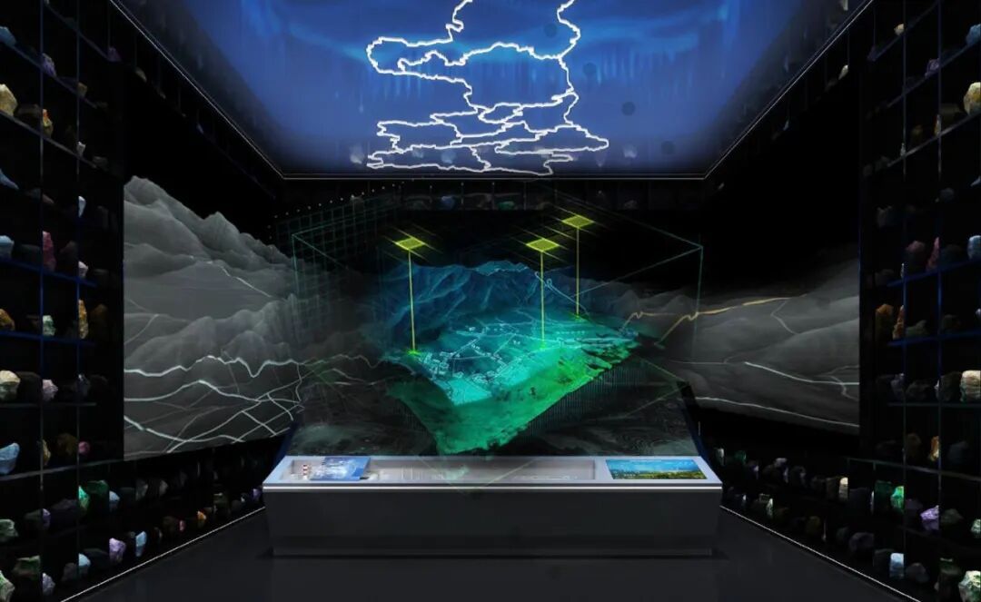 设计沉浸式互动空间,以电子沙盘、三折幕、触摸查询为主展项,介绍陕西矿产资源分布情况。滑轨屏结合标本详细介绍陕西境内日各类矿产资源。两侧矿产资源标本与顶部陕西地图剪影遥相呼应,营造整体氛围。