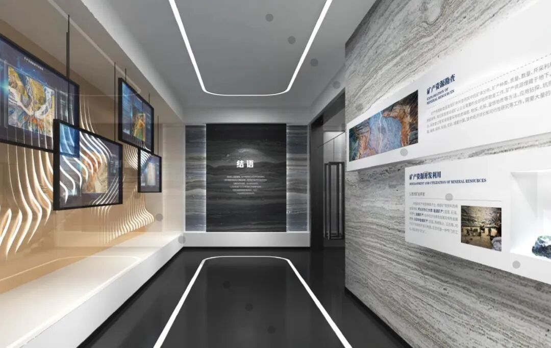 序厅采用抽象凿刻手法体现地质主题,带领观众走进地质世界,孤形LED拼接屏可播放陕西地矿集团有限公司企业宣传片,也可展示秦岭的壮美秀丽。