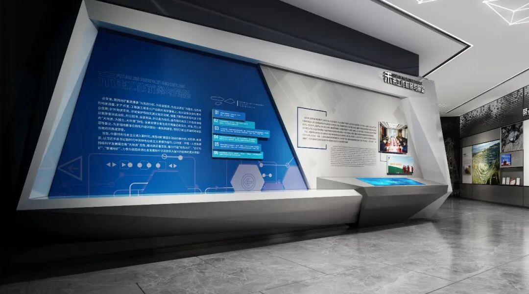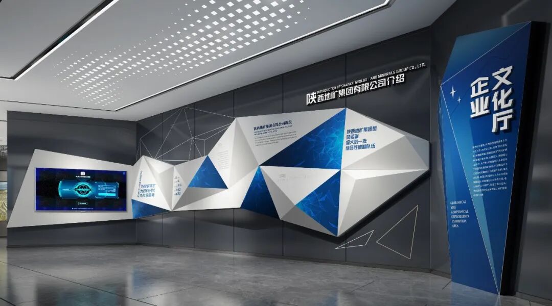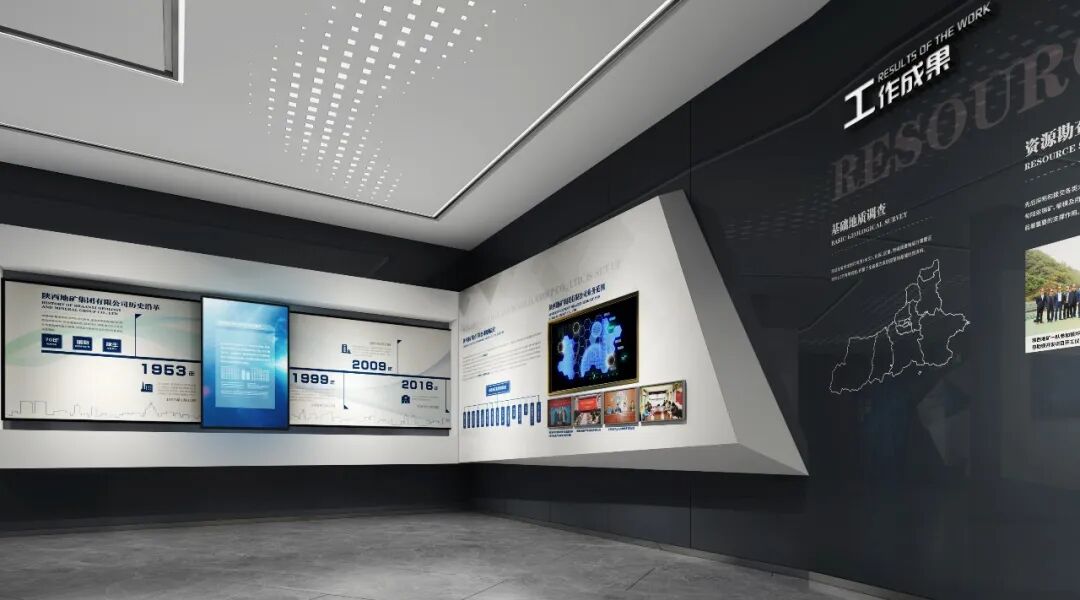 陕西地矿集团近70年的发展历程成果丰硕。灯箱、立体图版结合触摸屏展现陕西地矿集团有限公司在各个领域取得的辉煌成果,壁龛可展示成果证书等物品。