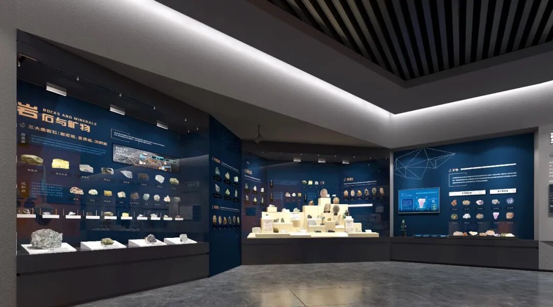 精美展柜错落展示矿物、岩石标本,其中将精美藏品747克的“狗头金”做特别展出。展柜旁配触摸查询系统,科普矿物的形成、分类和用途等内容。一侧翻版互动装置,展示实物的同时增加展览趣味性。
