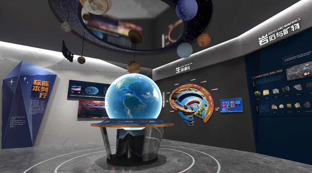 进入标本陈列厅,深色装饰结合顶部吊挂银河系行星营造宇宙神秘感,认识地球板设计多媒体内投球结合信息带介绍星云学说及地球诞生过程。