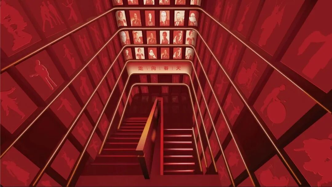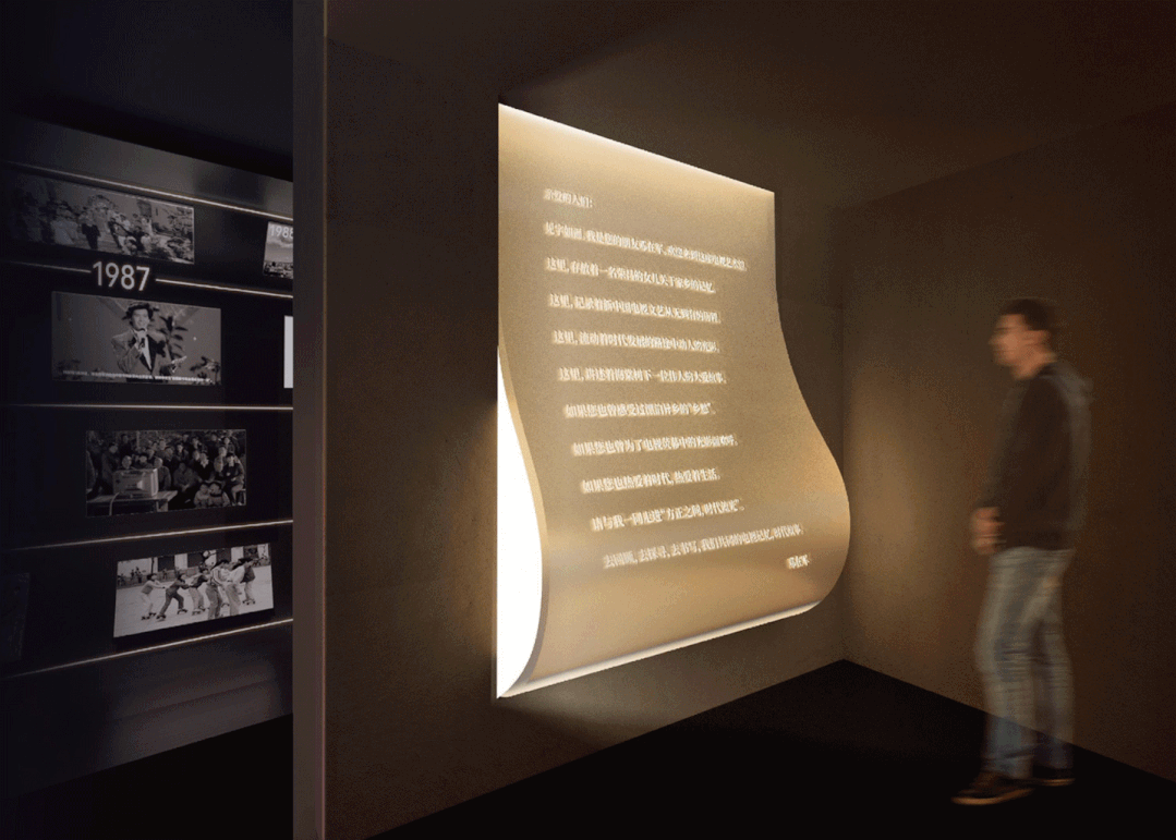 墙面设计凸出的立体纹理,作为转印从首届“春晚”至今历届总导演的手写签名的载体,用元素和色彩寓意十一届三中全会后中国电视文艺迎来了春天。