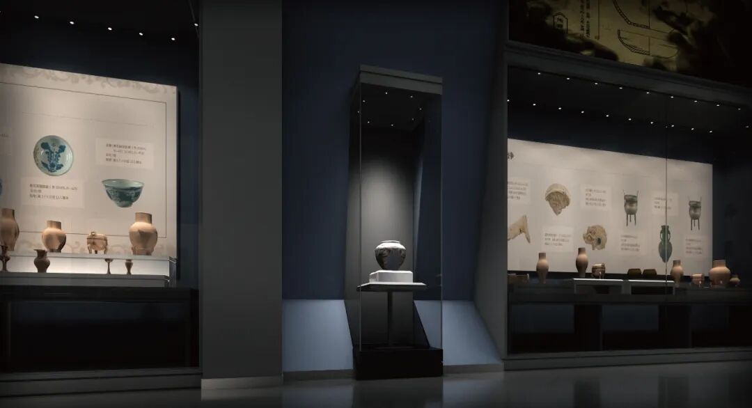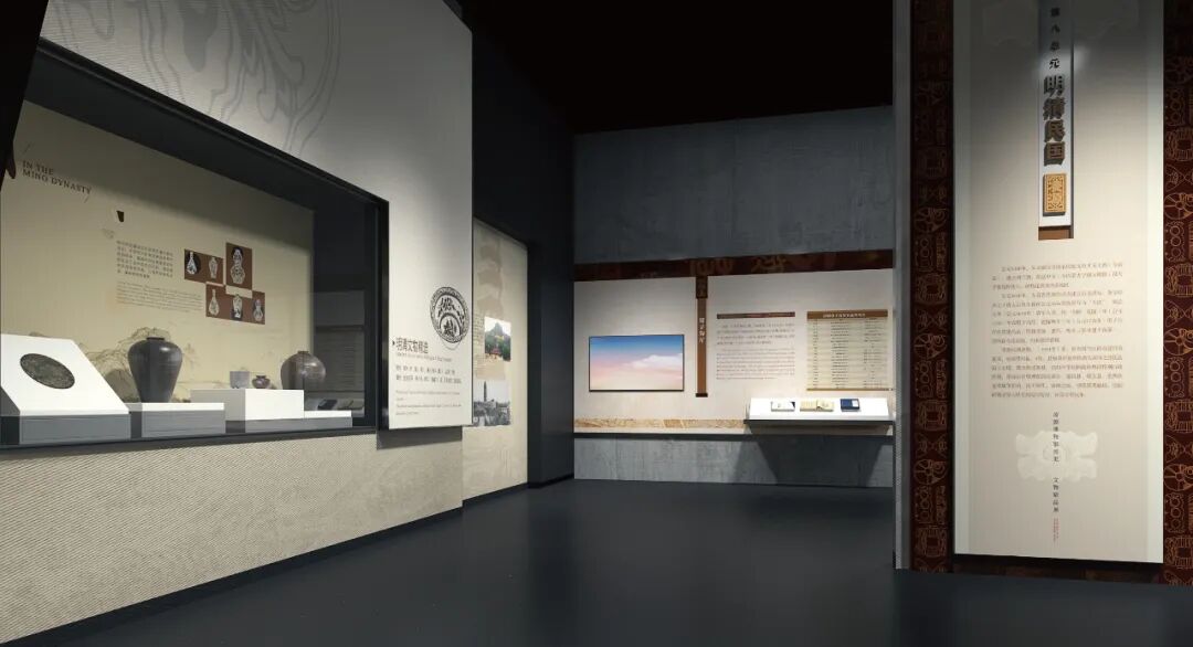 此单元展示明、清、民国时期历史和文物。图文介绍明清至民国时期历史简介,柜内展示明代瓷器、铜器。