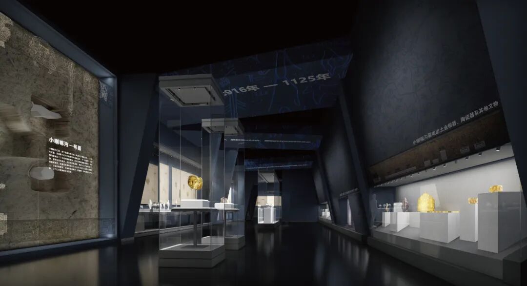 凌源境内小喇嘛沟辽墓是凌源地区迄今为止出土的辽代墓葬中规模最大、文物件数最多、文物等级最高的一座墓葬,充分反映了辽代以来贵族的生活景象。向内延申的展墙结合深色展示背景,构筑了小喇嘛辽墓的神秘感。