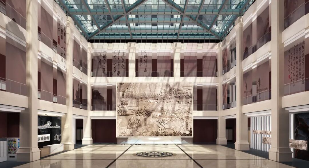 大厅以牛河梁红山文化纱幔为主视觉。镌刻红山人祭祀、议事、渔猎、农耕、制陶、制玉场景。由三层吊挂至二层的中国风纱幔,营造博物馆静谧氛围。