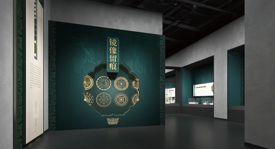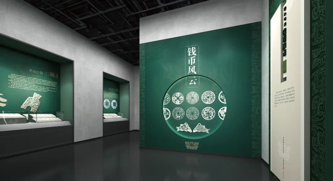 钱币专题展以青铜绿为主要色调,以古钱币的圆形造型,艺术化点明空间主题,营造空间氛围。