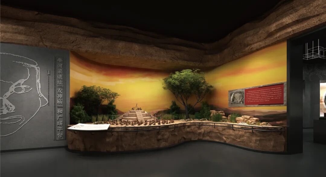 利用转角的空间位置,设立全景式微缩模型的展示形式,以人、物、细节等几方面的刻画,还原了牛河梁遗址“女神庙”和广场原始氏族大型祭祀活动动态场景。