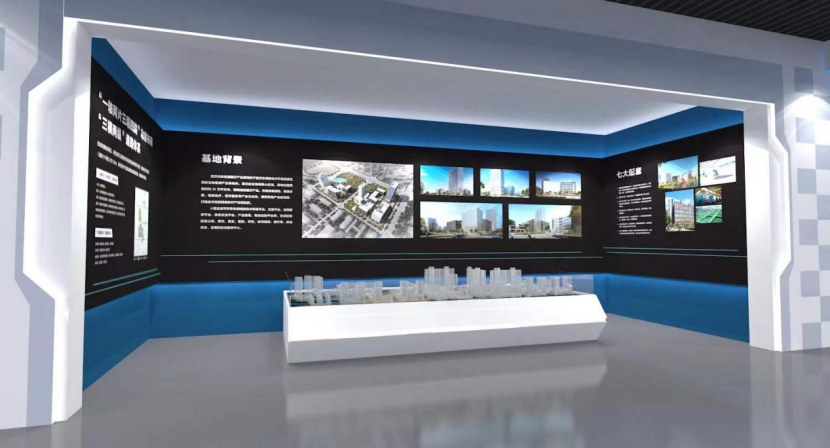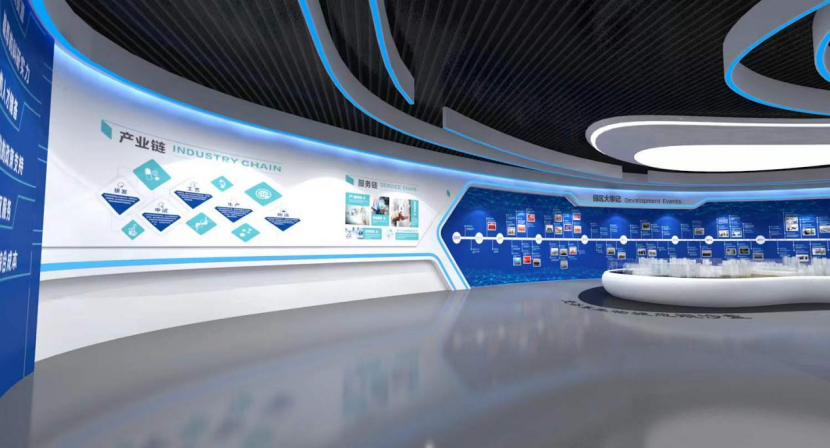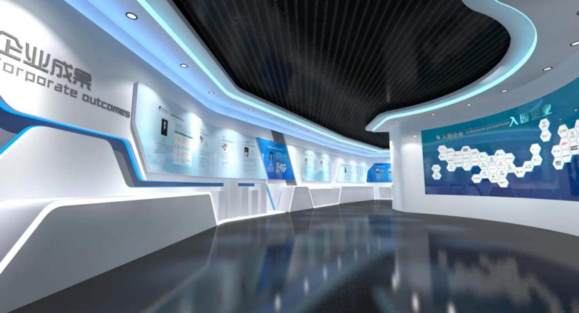 随后进入展厅的后半部分,长长的一条走廊是具体的园区企业成果展示,前方的异形台则摆放着企业的创新产品。
