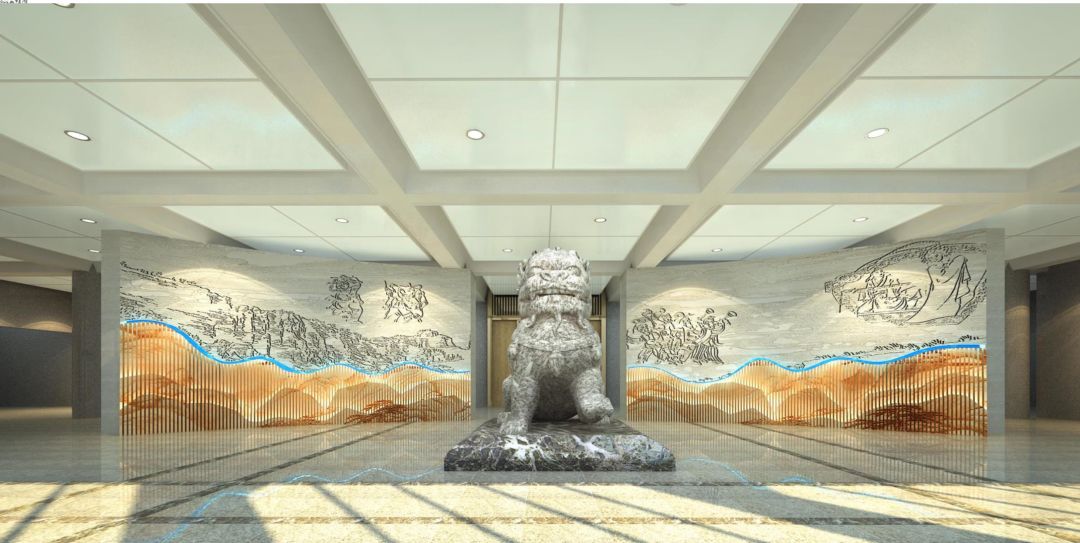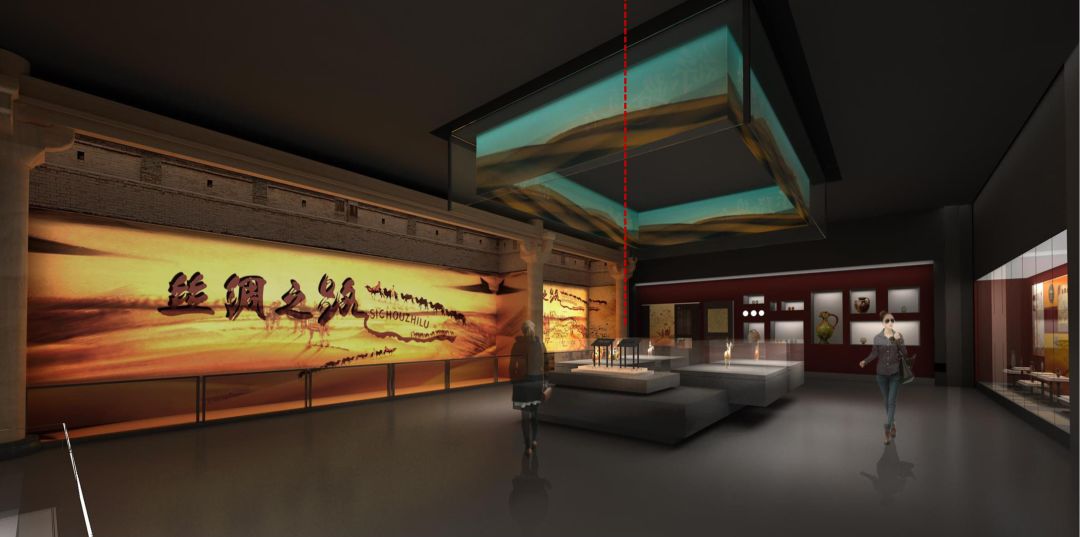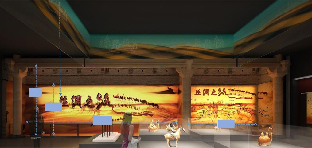 丝路万里在墙面彩喷造型的基础上,辅以多媒体影像,光影交错之间,生动形象地展现万里丝路,万国来朝的繁荣昌盛景象,突出丝绸之路的开辟对今日中国发展的深刻意义。