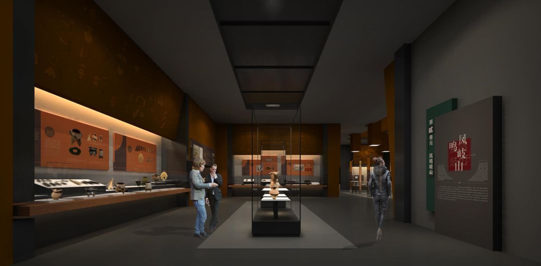 凤起周原融合墙面造型与多媒体投影,绘出周族初兴之时欣欣向荣之势,鸾凤和鸣,盘旋于凤雏宫之上,使参观者仿佛亲历悠远的先周时代。